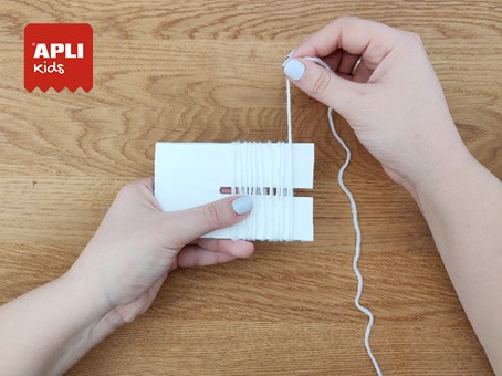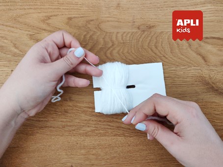 Maintenant, une fois le gabarit terminé, tu peux commencer à préparer tes pompons : enroule la laine autour de l'extrémité de l'incision, délicatement et sans serrer.