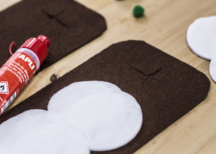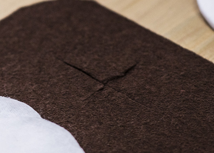 Coupez deux morceaux de feutrine APLI de taille identique (10 cm x 29,5 cm), que vous rembourrerez ensuite avec du coton afin que l'étui ait davantage de volume. Sur l'un des petits côtés, arrondissez les angles puis pratiquez ensuite une incision en forme de « + » sur la partie supérieure pour pouvoir ensuite brancher le fil de votre chargeur.