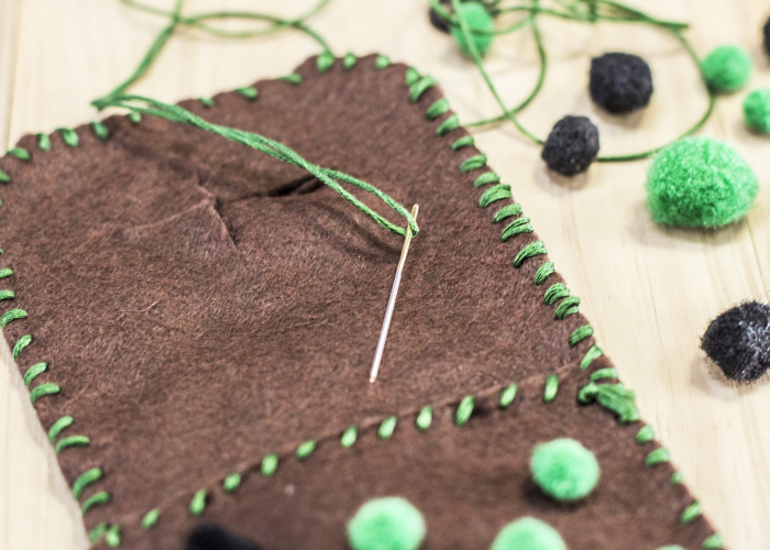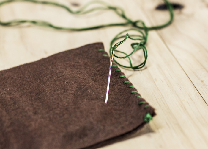 Vous devez coudre en premier la petite partie inférieure, celle qui n'a pas les angles arrondis. Une fois cette partie cousue à l'aide du fil, pliez les pièces de feutre sur 9 cm environ, comme une pochette. Il vous suffit alors de coudre, du mieux que vous le pouvez, tout le bord de l'étui déjà plié, en essayant de laisser le même espace entre chaque point.
