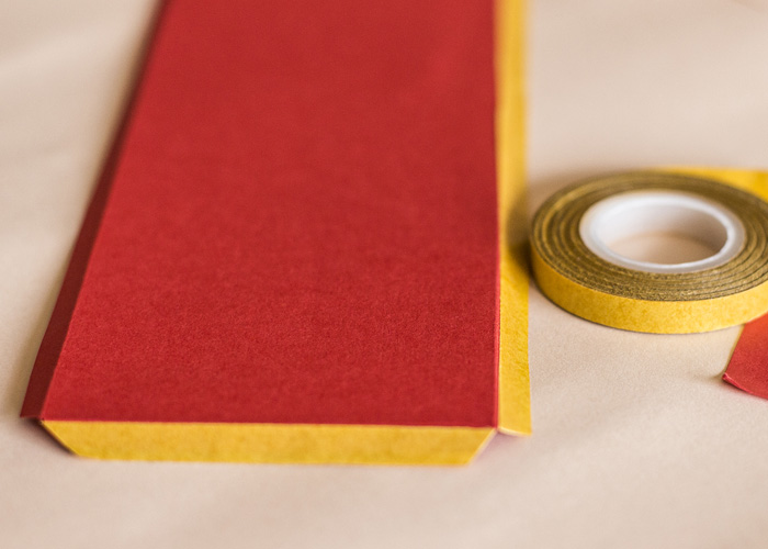 Étape 3 : Décollez le papier jaune du scotch double face et faites des petites franges sur les deux côtés les plus longs de chaque forme en carton.