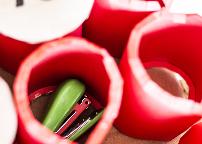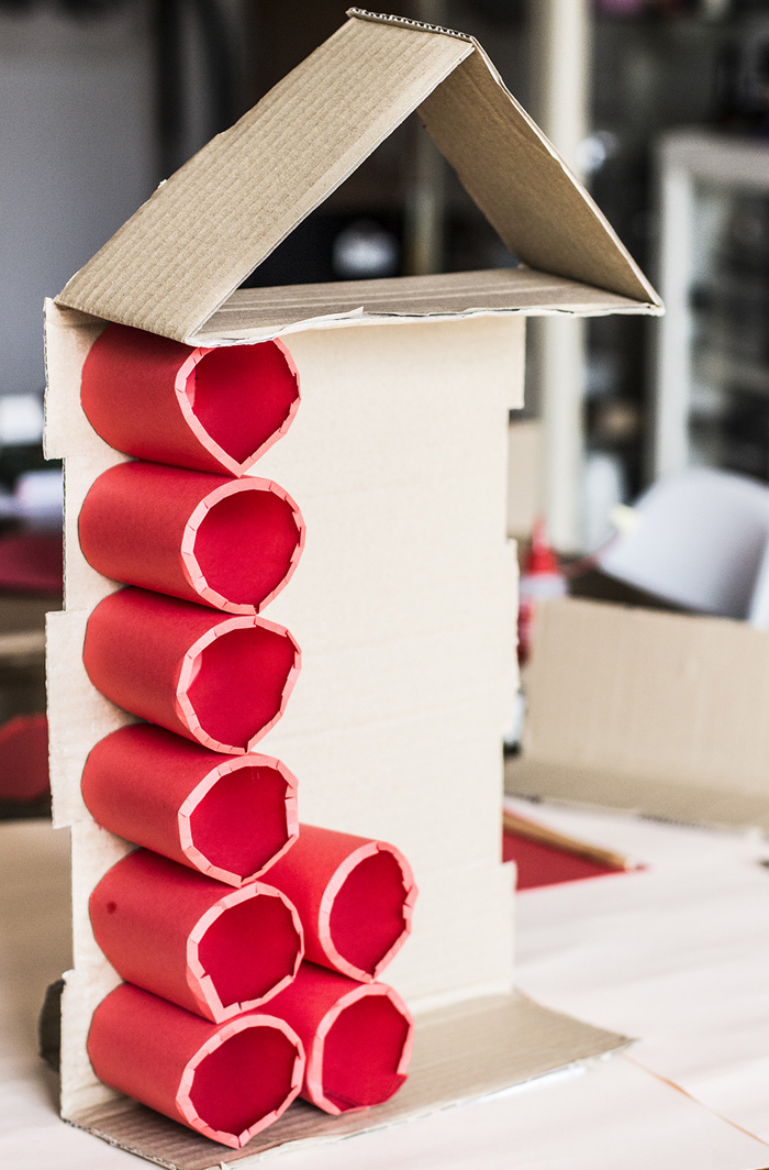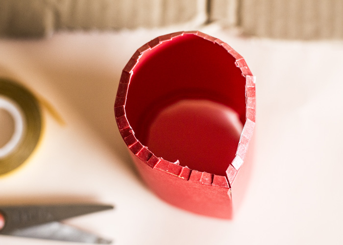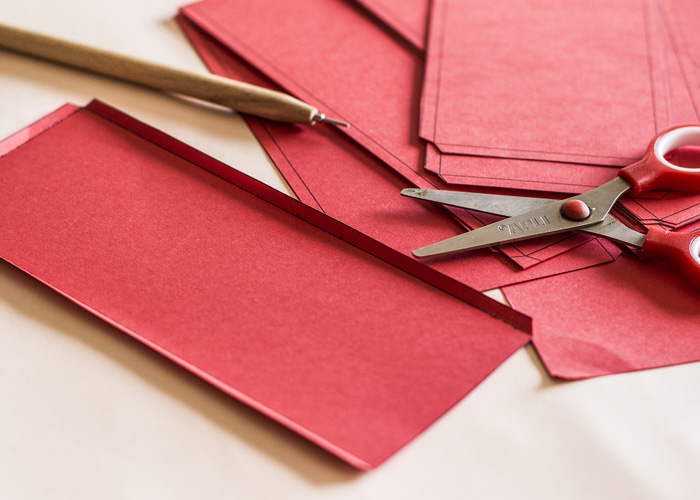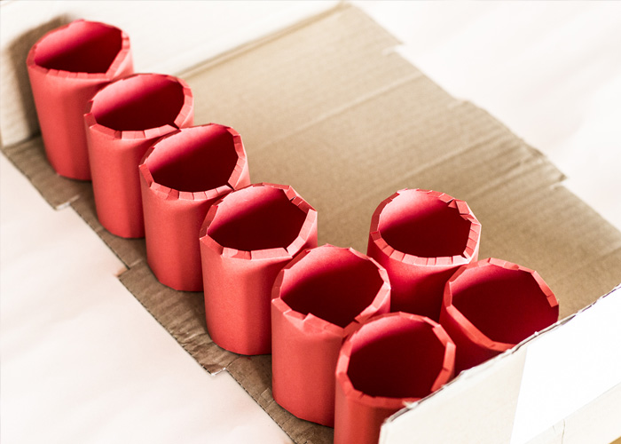 Étape 1 : Téléchargez le MODÈLE_cylindres afin de pouvoir faire les cylindres en carton rouge. Sur le modèle, vous remarquerez qu’il y a deux croquis identiques : vous ne devez donc imprimer au total que 12 feuilles de carton pour obtenir les 24 cylindres. Avec une imprimante A4, introduisez directement les feuilles de carton A4 APLI et imprimez les croquis sur celles-ci. Découpez-les ensuite en suivant la ligne extérieure et, avec le poinçon, indiquez les fentes qui serviront plus tard à plier et assembler les cylindres.