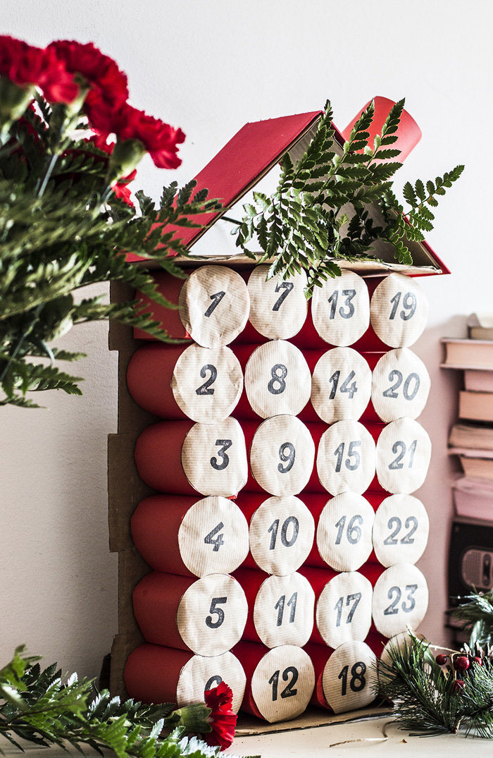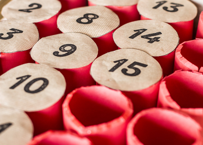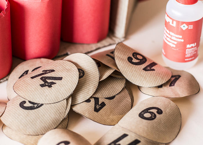 Étape 6 : Téléchargez le modèle avec les numéros et imprimez-le sur du papier kraft. Après avoir placé les 24 cylindres sur le carton, découpez les cercles avec les numéros. Avant de fermer les cylindres avec les cercles en papier kraft, n’oubliez-pas d’introduire les surprises que vous souhaitez découvrir tous les jours. Vous pouvez y placer des petits cadeaux APLI comme des bouts de papier pliés avec des phrases inspirantes, pour donner une petite touche joyeuse à chaque journée.