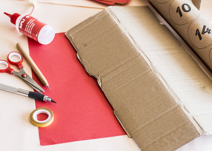 Étape 5 : Avec le carton, joignez deux morceaux en forme de toit afin que cela ressemble à une maison. Placez également une sorte de socle, fait avec le même matériel, sur la partie arrière du calendrier pour qu’il soit plus stable.