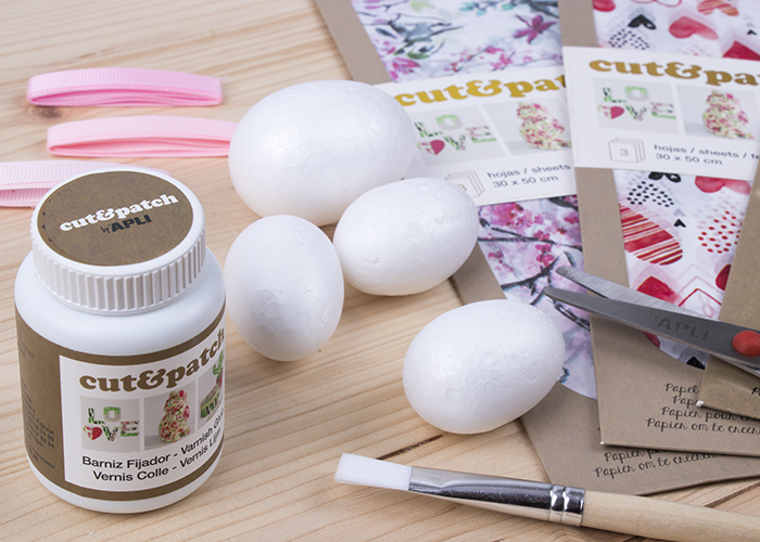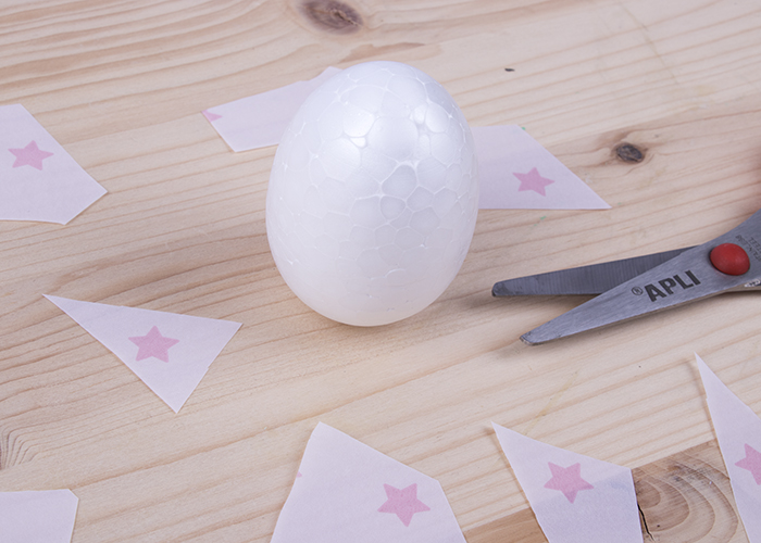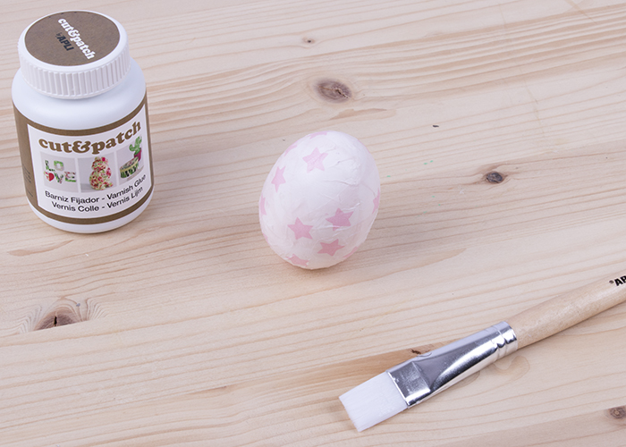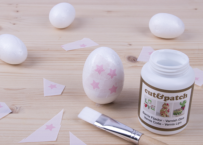 Avec le pinceau, appliquez une fine couche de vernis sur l’œuf en polystyrène et collez un à un les morceaux de papier Cut & Patch que vous avez découpé.
