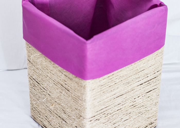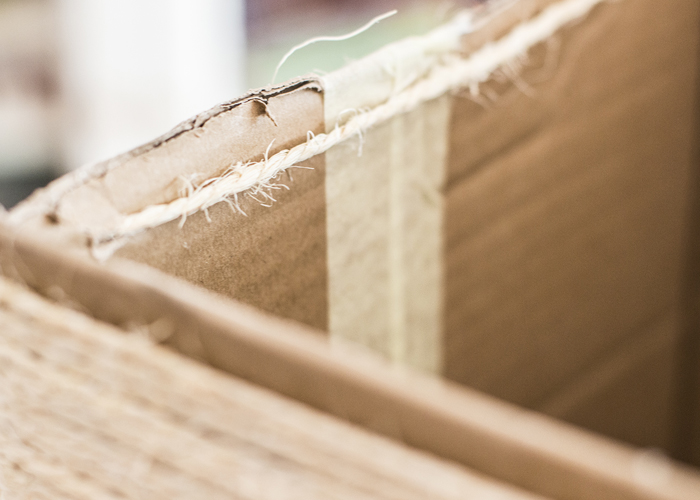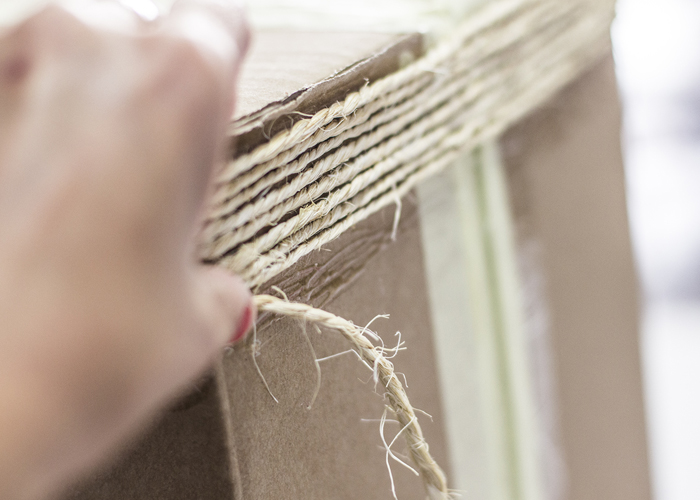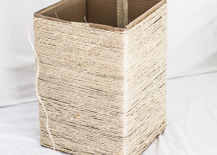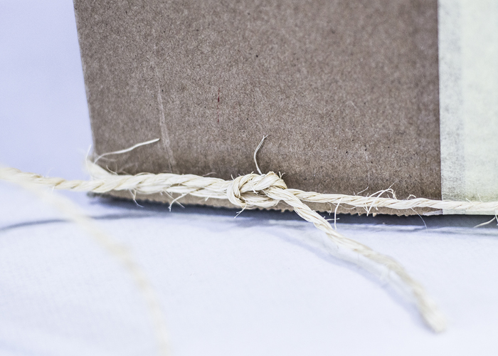 Commencez par enrouler la corde de sisal autour du carton. Pour cela, commencez par faire un nœud autour de celui-ci sur la partie inférieure.