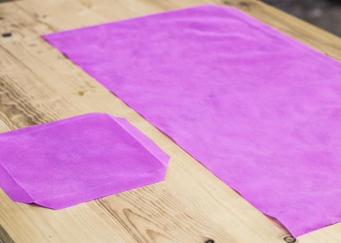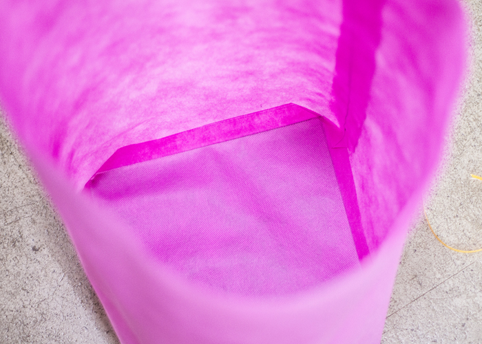Une fois le carton recouvert de corde en sisal, réalisez le sac intérieur avec le Dressy Bond. Pour cela, vous devez découper deux pièces : une de 1 mètre par 48 cm ; l'autre de 25 cm x 25 cm. Laissez une marge de 1,5 cm sur chaque côté de la pièce carrée, afin de pouvoir la coller à la pièce la plus longue : elle servira de fond. Pour l'autre pièce, laissez une marge de 1,5 cm sur un seul des côtés courts uniquement.