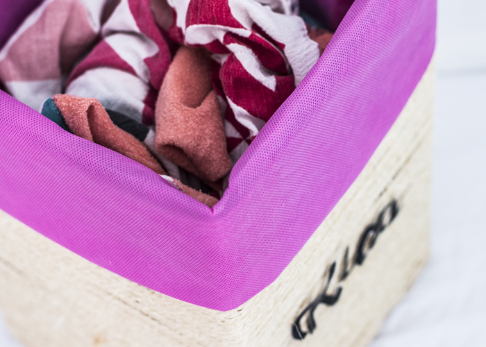 Placez le sac en Dressy Bond à l'intérieur du panier et doublez-la au-dessus afin qu'elle dépasse à l'extérieur du panier. Vous pouvez également ajouter une lettre, une phrase ou l'élément de votre choix pour rendre ce panier unique et singulier.