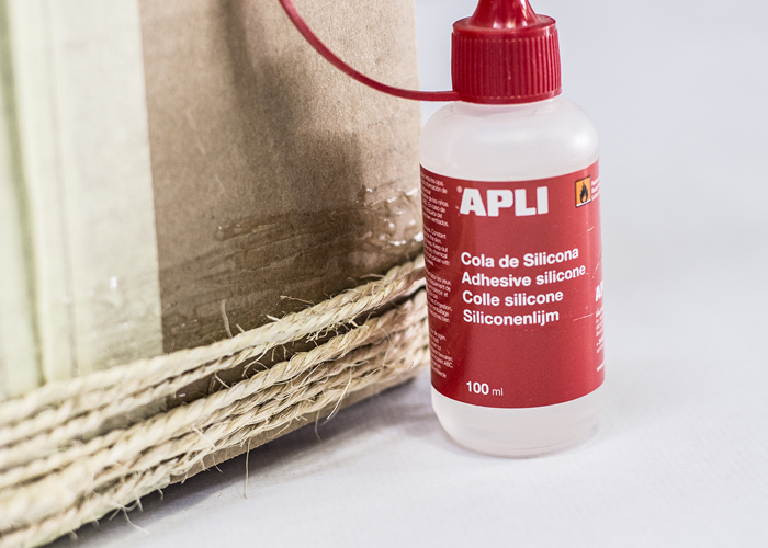 Ensuite, imprégnez les côtés du carton avec de la colle silicone, à mesure que vous enroulez la corde sur les côtés. Cela vous prendra un certain temps de recouvrir le carton, mais le jeu en vaut la chandelle.
