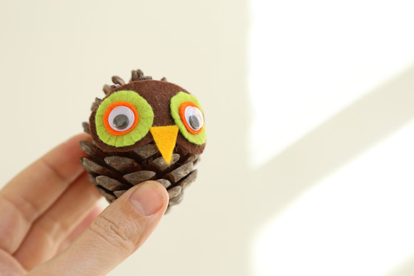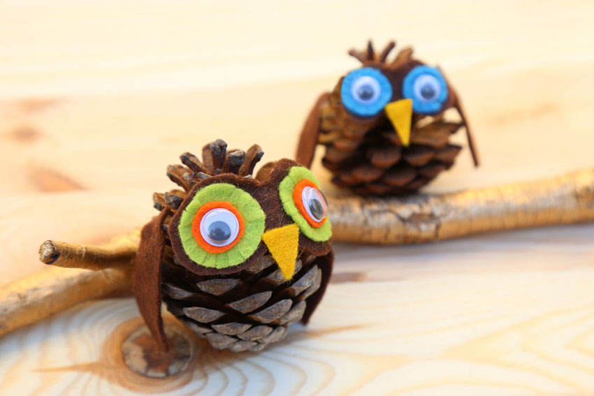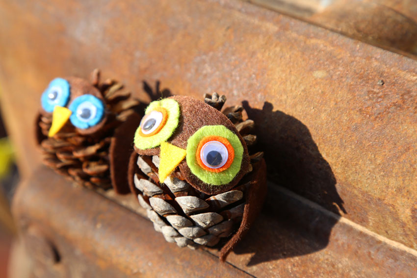 Les voici, les voilà ! Vous pouvez vous amuser avec des pommes de pin de tailles différentes et ainsi créer toute une famille de hiboux.