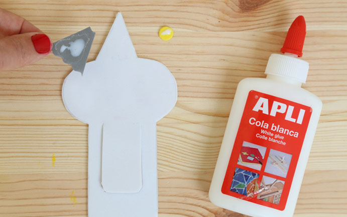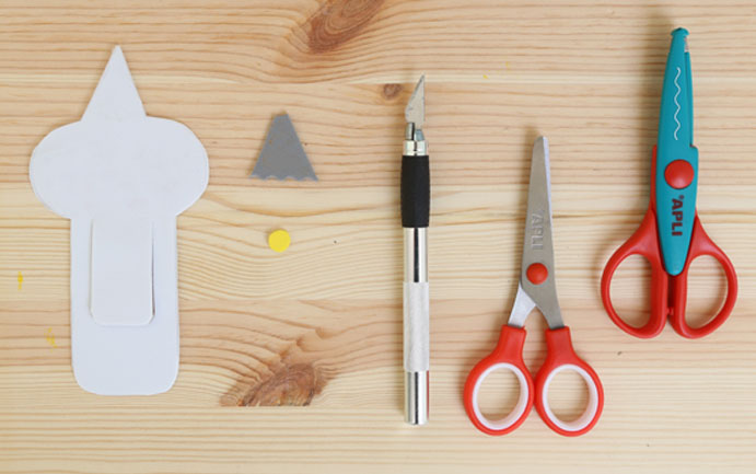 Découpe toutes les pièces à l’aide des ciseaux. La découpe à l’intérieur de la grande pièce se fait à l’aide du cutter. La taille des pièces dépendra du livre dans lequel tu le glisseras.