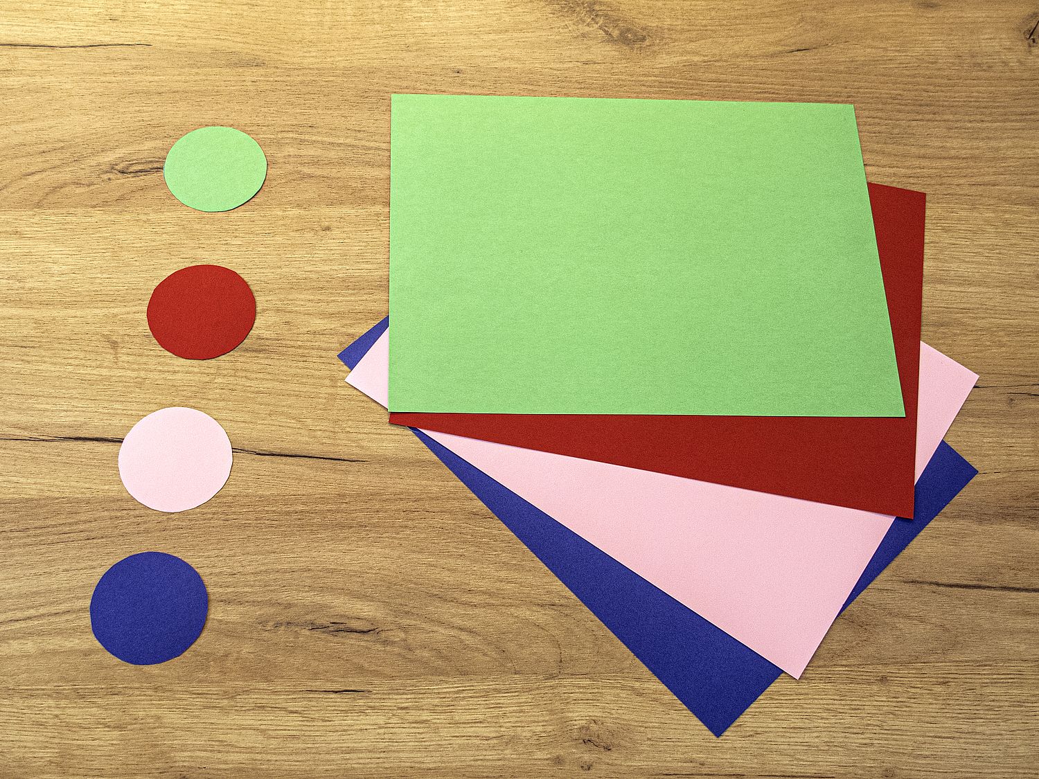 1. Découpez des cercles sur le papier cartonné. Nous avons utilisé le vert pour le dragon, le rose pour la princesse, le rouge pour la rose et le bleu pour le chevalier.