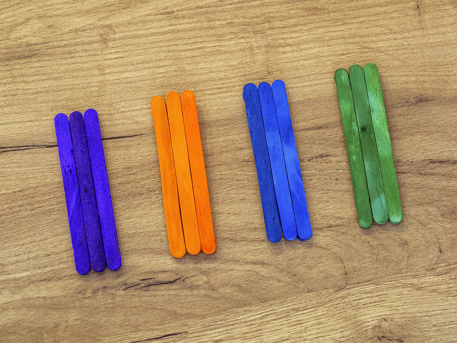 1. Joignez les baguettes en bois de différentes couleurs. Rassemblez trois bâtons et collez un autre bâton en diagonale derrière avec de la colle blanche.