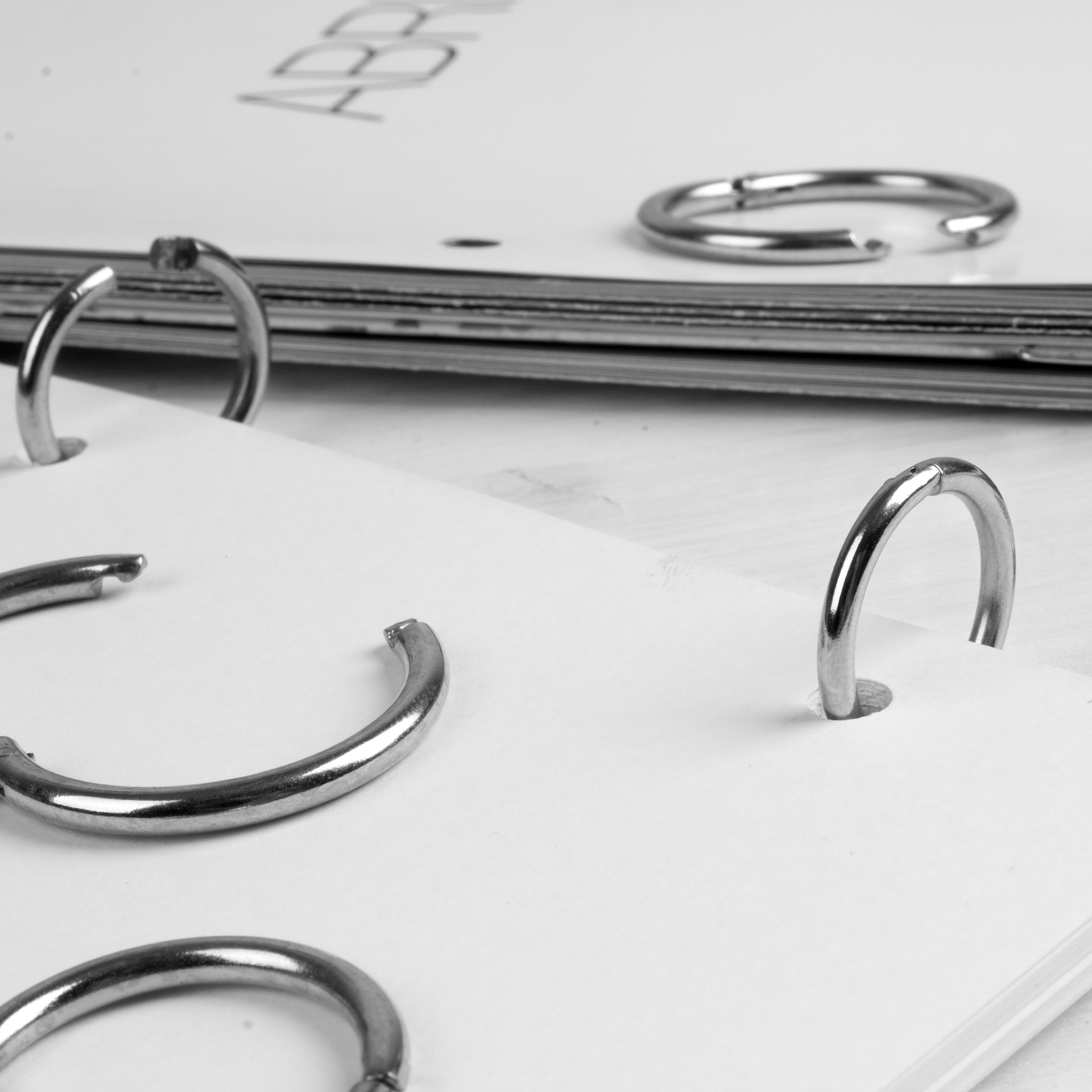 Anneaux métalliques articulés de Ø 38 mm. Finition en nickel pour une meilleure durabilité et résistance. Idéal pour relier les feuilles, archiver des notes, pour les travaux de scrapbooking, albums, porte-clés etc.
