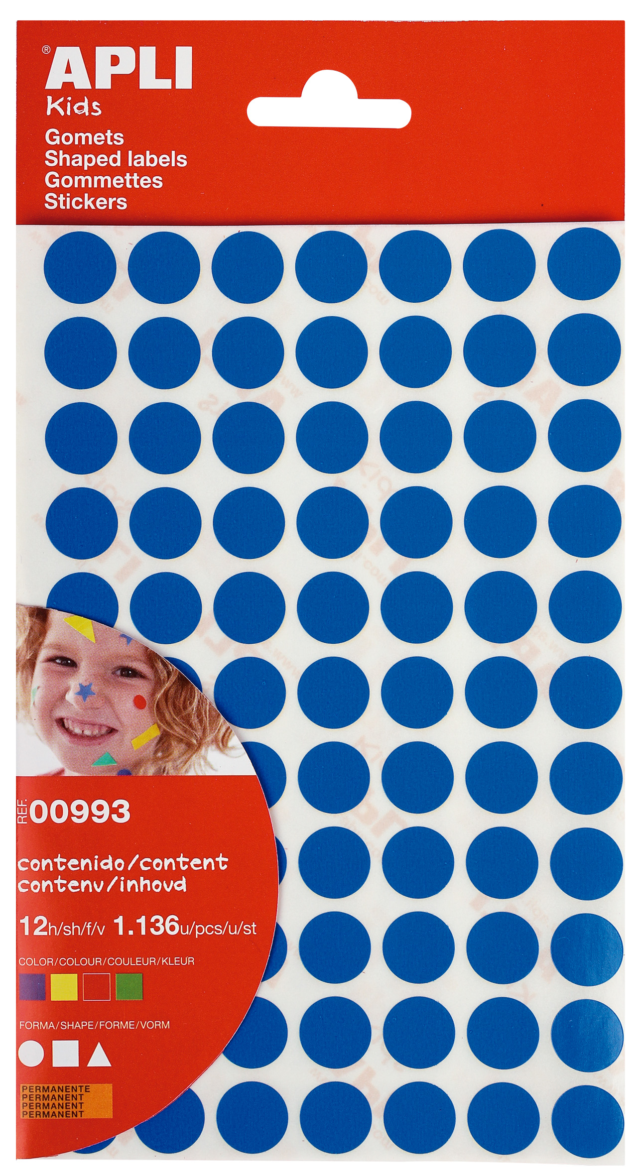 Sachet de gommettes adhésives permanentes de diverses couleurs, formes et dimensions assorties. Chaque sachet contient 12 feuilles avec différentes gommettes, un total de 1 136 gommettes par sachet . Un produit indispensable dans tous les foyers et à l’école. Avant d’apprendre à se servir des crayons et de la peinture, les enfants peuvent découvrir le monde des couleurs et des formes grâce à ces gommettes. Jouer et créer avec des gommettes est une activité basique qui permet de développer la psychomotricité fine et d’exercer, en même temps, diverses capacités et habiletés telles que la connaissance des couleurs, des formes géométriques et des dimensions, le développement de la logique et la créativité, le travail en équipe ou encore la maîtrise de l’espace, entre autres. De plus, les gommettes APLI respectent les normes les plus strictes de qualité et de sécurité. Fabriquées dans le respect des normes EN-71 et de la chaîne de traçabilité FSC : - Adhésif à base d’eau - Sans solvants - Papiers ECF (leemental Chlorine Free) - Matériaux 100% recyclables *Catégories de gommettes : Triangles : - 15 x 15 x 15 mm : 520 gommettes (130 par couleur) Ronds : - Ø 13 mm : 308 gommettes (77 par couleur) Carrés : - 12 x 12 mm : 308 gommettes (77 par couleur)