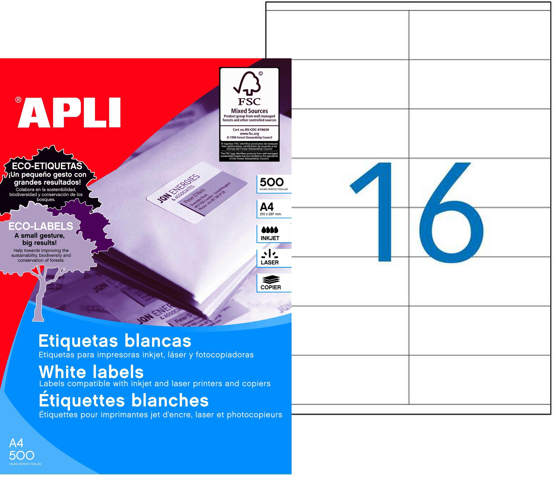 Etiquettes blanches multi-usage aux bords droits de dimensions 105,0 x 35,0 mm avec un adhésif permanent. Paquet de 500 feuilles (8 000 étiquettes).