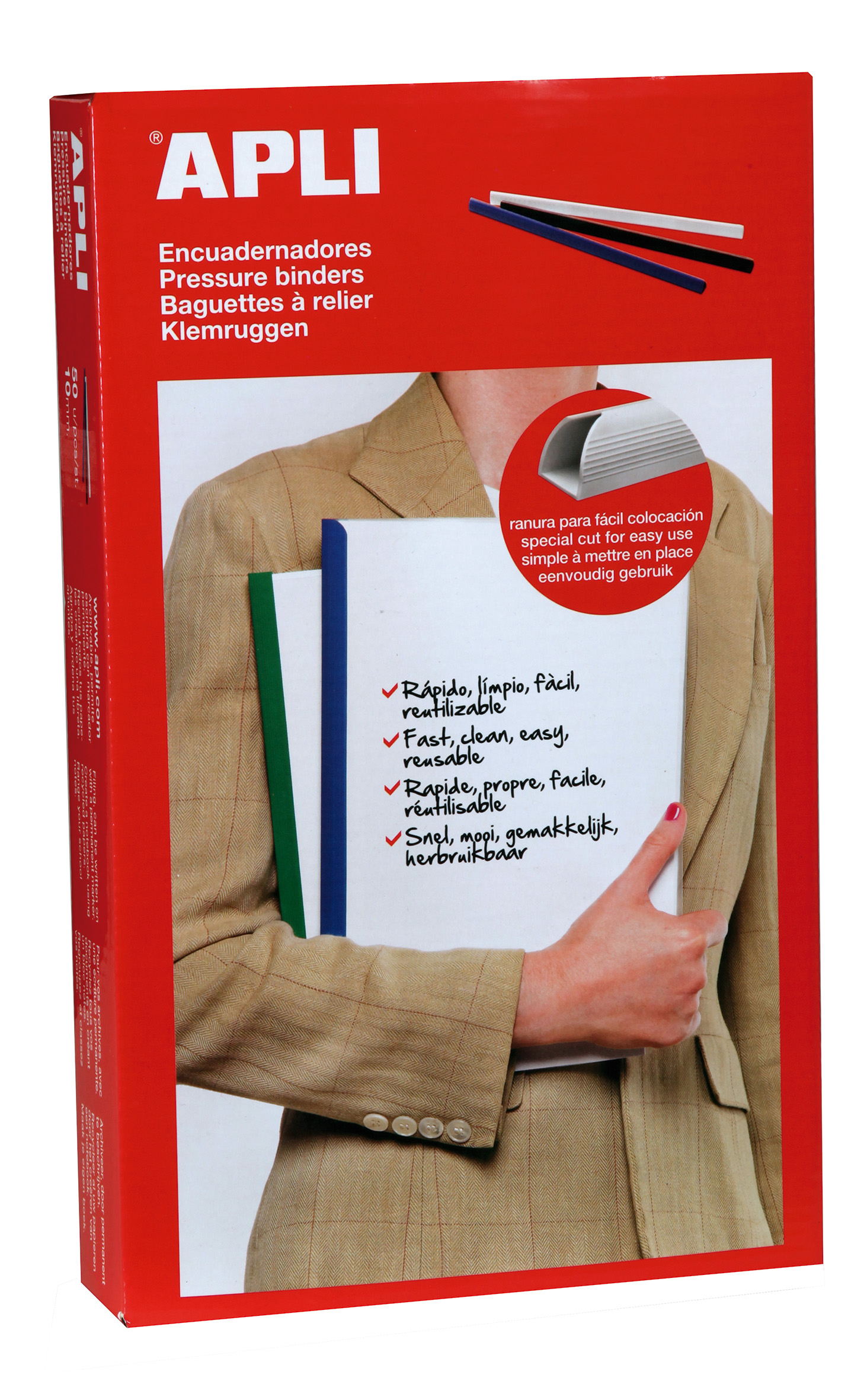 Reliures glissantes de couleur blanc dimension 15 x 297 mm (A4). Le système le plus simple pour relier vos projets, travaux, brochures, présentations etc. Inclut une rainure pour une insertion simplifiée des feuilles.
