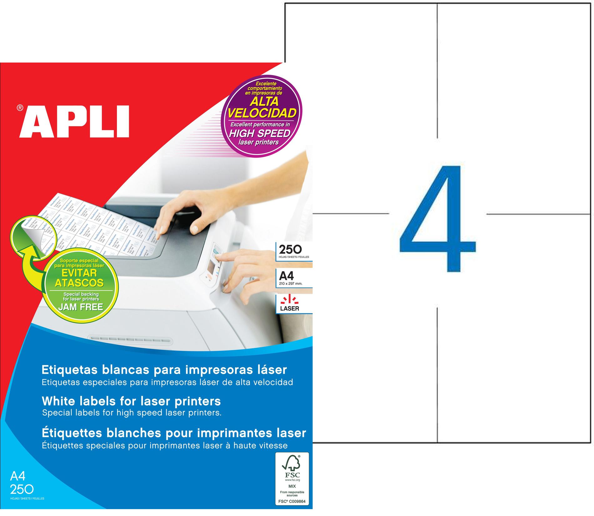 Etiquettes blanches laser aux bords droits dimensions 105,0 x 148,0 mm avec un adhésif permanent pour les imprimantes à grande vitesse. Paquet de 250 feuilles (1 000 étiquettes).