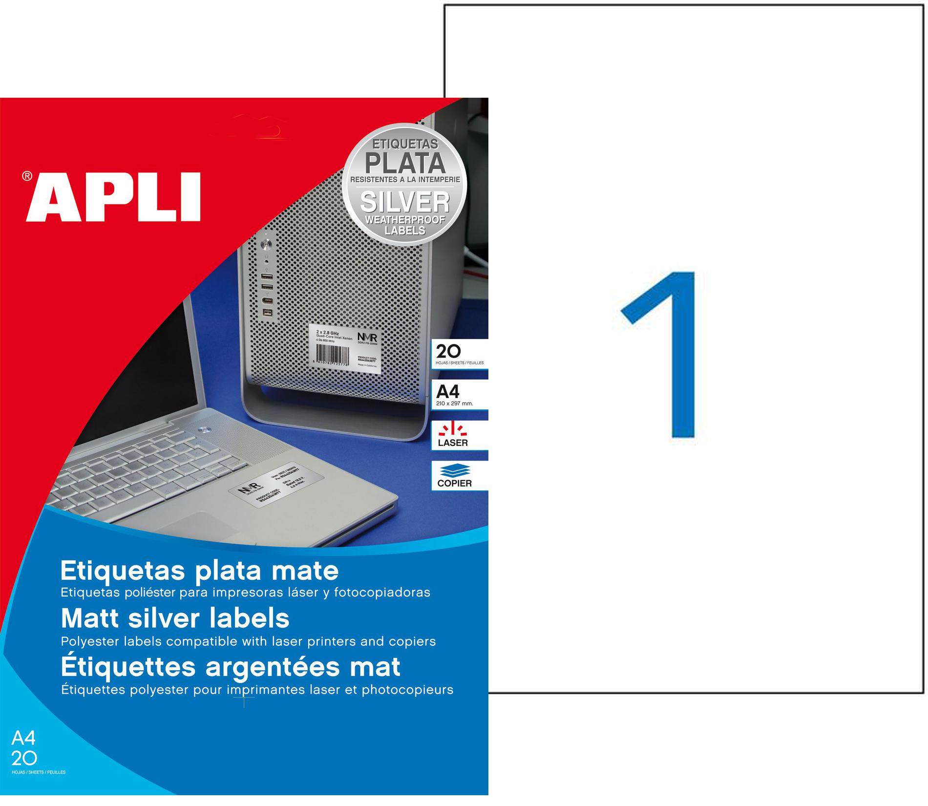 Étiquettes argent métallisée coins droits dimensions 210,0 x 297,0 mm avec un adhésif permanent. Paquet de 20 feuilles (20 étiquettes).