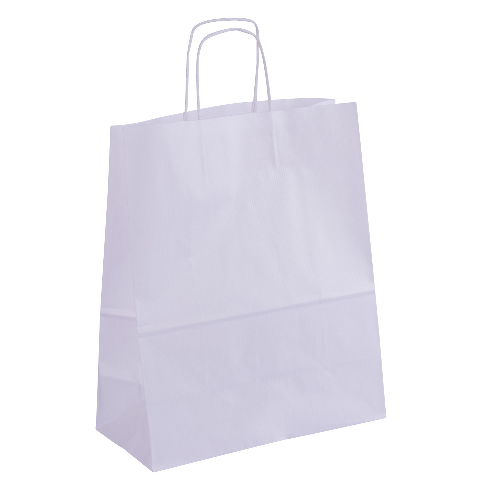 Sacs en papier Kraft couleur blanche dimensions 25 x 11 x 31 cm. Sacs fabriqués avec papier Kraft de 100 g/m², grande résistance à la déchirure et anses arrondies pour faciliter leur transport.
