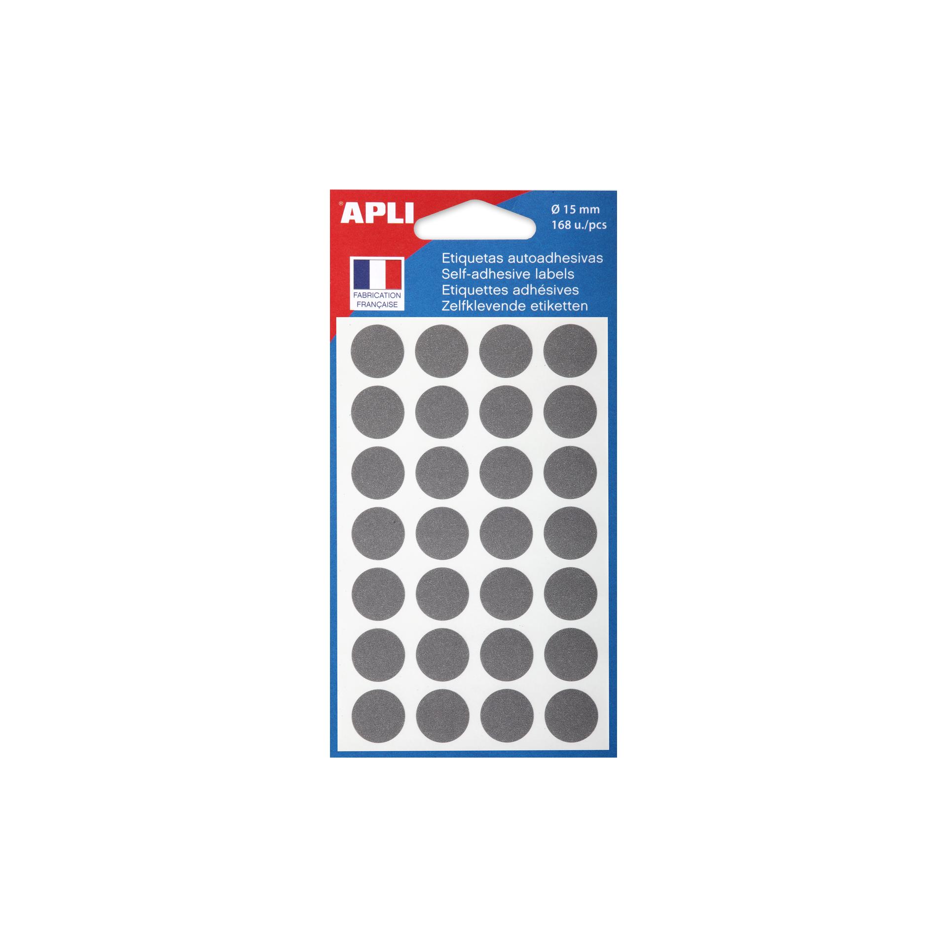 Pastilles gris adhésif permanent diamètre 15 mm. Pochette de 168 pastilles.