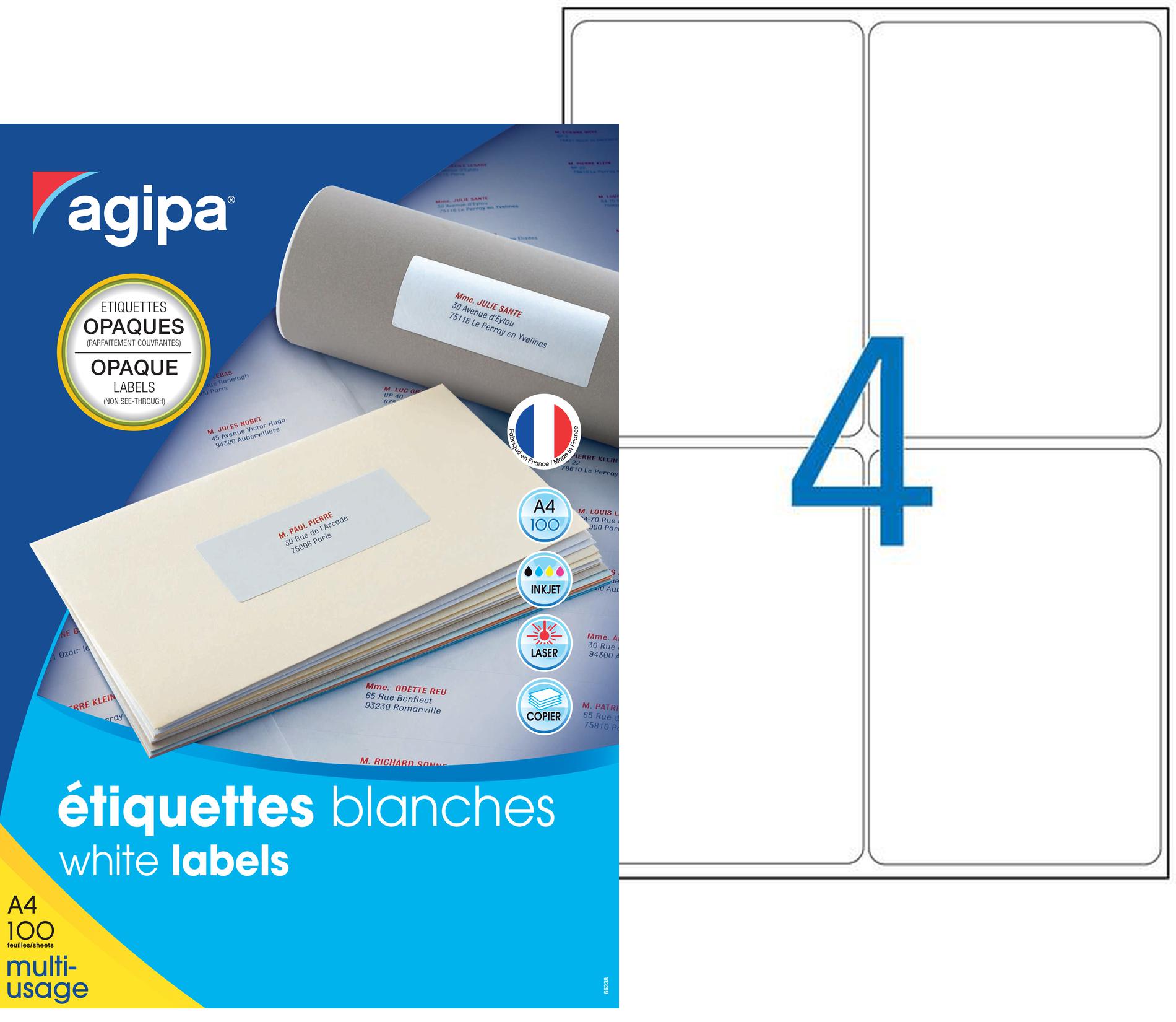 Étiquettes blanches opaques coins arrondis dimensions 99,1 x 139,0 mm avec un adhésif permanent. Boîte de 100 feuilles (400 étiquettes).