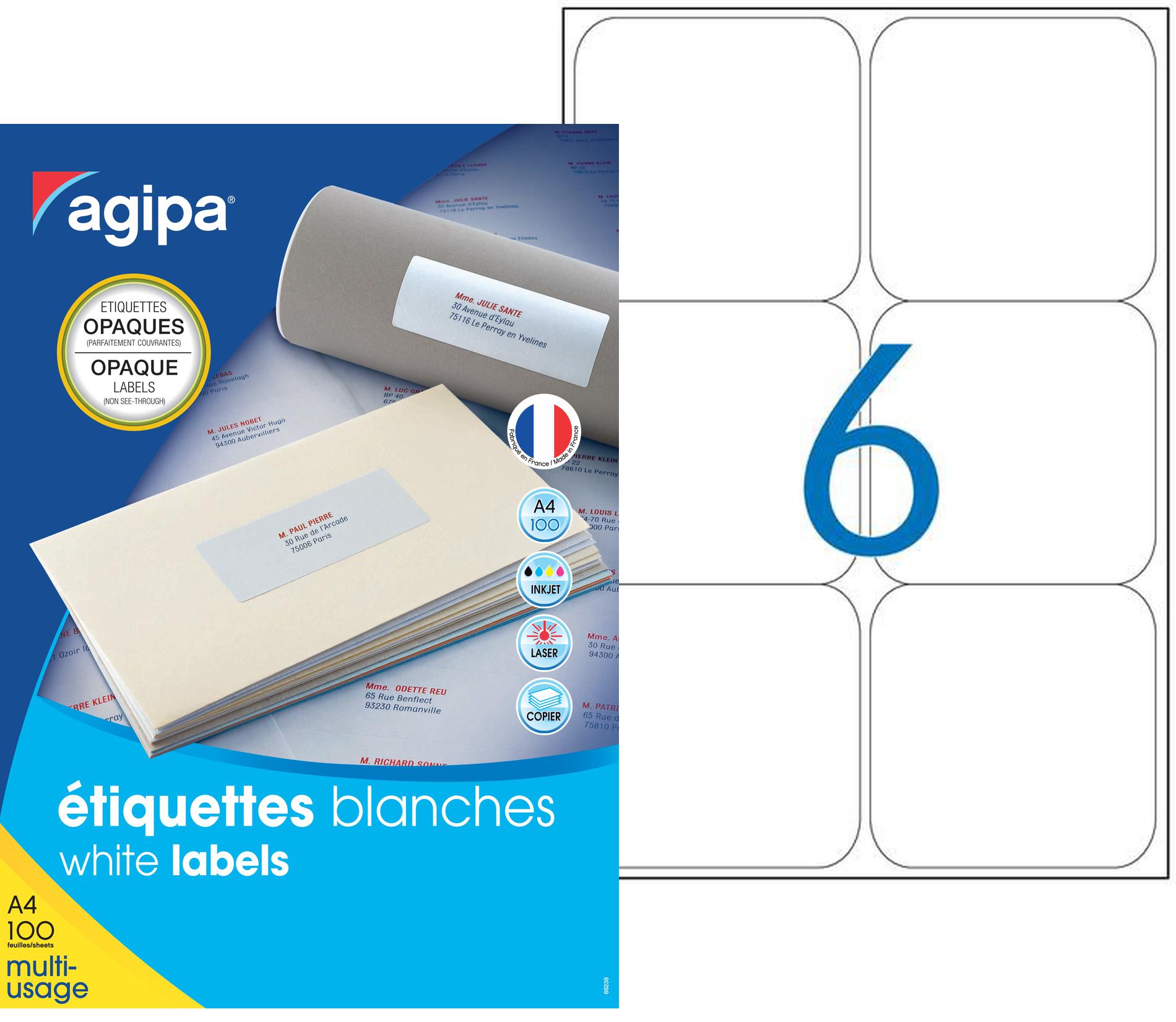 Étiquettes blanches opaques coins arrondis dimensions 99,1 x 93,1 mm avec un adhésif permanent. Boîte de 100 feuilles (600 étiquettes).