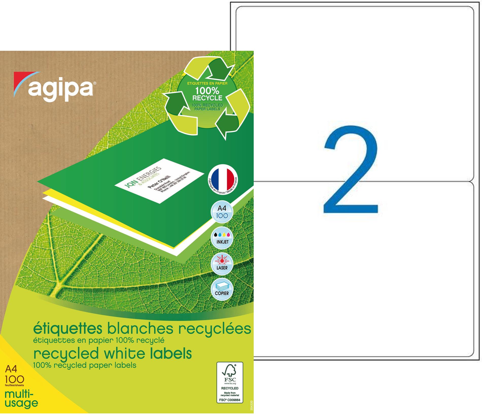 Étiquettes recyclées blanches multi-usage aux bords arrondis dimensions 199,6 x 143,5 mm avec un adhésif permanent. Paquet de 100 feuilles (200 étiquettes). INDISPENSABLES : Étiquettes adhésives en papier 100 % recyclé. Adhésif acrylique à base d'eau 100 % non polluant. Papier adhésif 100 % sans chlore certifié FSC.