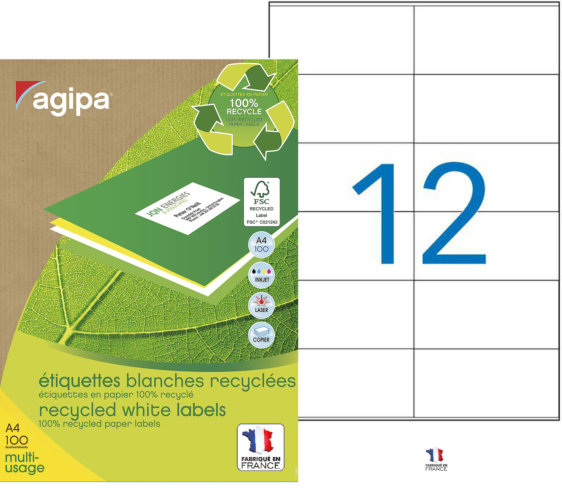 Étiquettes recyclées blanches multi-usage aux bords droits dimensions 105 x 48 mm avec un adhésif permanent. Paquet de 100 feuilles (1 200 étiquettes). INDISPENSABLES : Étiquettes adhésives en papier 100 % recyclé. Adhésif acrylique à base d'eau 100 % non polluant. Papier adhésif 100 % sans chlore certifié FSC. Boîte en carton 100 % recyclée, film plastique recyclable. DE QUALITÉ : Les étiquettes Apli sont fabriquées avec un papier de qualité certifié FSC. PRATIQUES : Grâce à leur adhésif résistant aux hautes températures, les étiquettes multi-usages Apli Agipa sont anti-bourrage. Pour vous, ce sera un gain de temps et de papier conséquent. COMPATIBLES : Les étiquettes à imprimer Apli Agipa sont compatibles avec les impressions laser, copieur et jet d’encre. Elles sont réalisées en France avec toute l’expérience d’Apli. FACILES : Tous les formats de nos étiquettes sont présents dans notre logiciel gratuit Agipa Soft Pro, pour vous permettre une personnalisation rapide et aisée. Parfaites pour identifier des envois par courrier, des objets, des colis ou pour classer les documents. Excellente qualité d’impression aux imprimantes ink jet, laser ou copieurs. Téléchargez le logiciel gratuit pour créer et imprimer tout type d’étiquette sur www.apli.fr