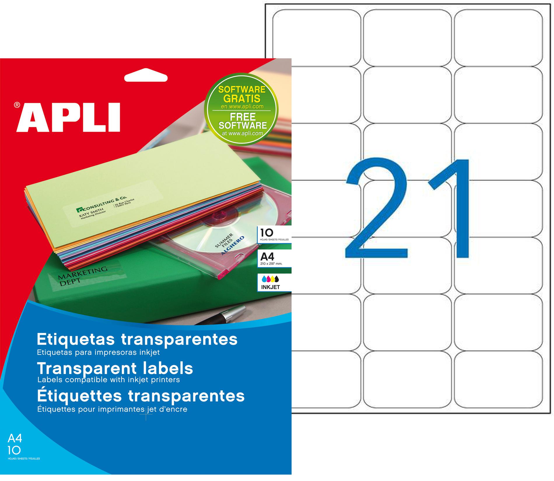 Etiquettes transparentes bords arrondis dimensions 63,5 x 38,1 mm avec un adhésif permanent. Paquet de 10 feuilles (210 étiquettes).