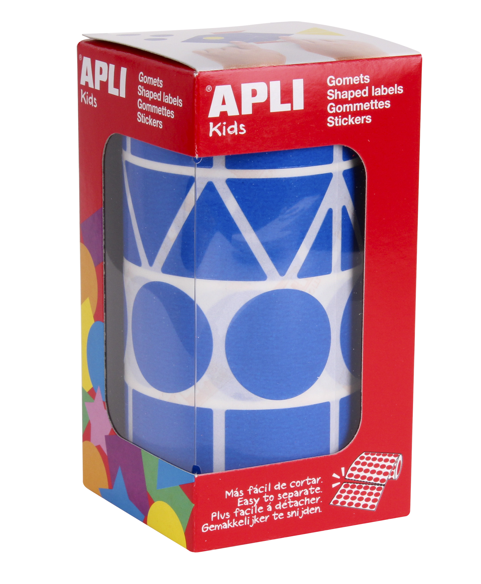 Rouleau de gommettes de diverses formes de couleur bleue avec un adhésif permanent. Le rouleau contient 4 formes distinctes : triangles (27 x 27 x 27 mm), ronds (Ø 27 mm), carrés (27 x 27 mm) et rectangles (27 x 20 mm). Chaque rouleau contient 59 feuilles prédécoupées pour une séparation facile, un total de 1 357 gommettes par rouleau.