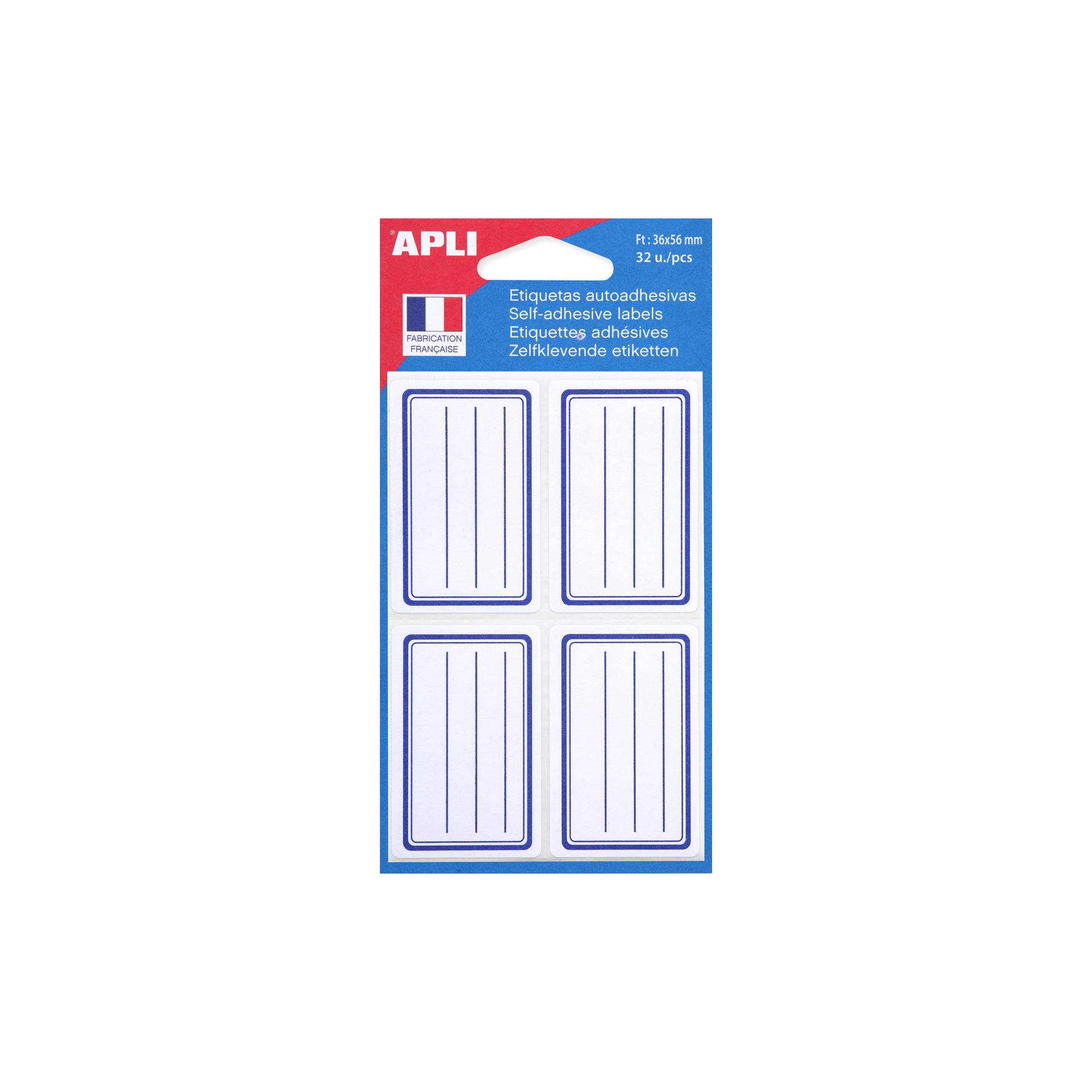 Étiquettes scolaires lignes et cadre bleus adhésif permanent 36x 56 mm. Pochette de 32 étiquettes.