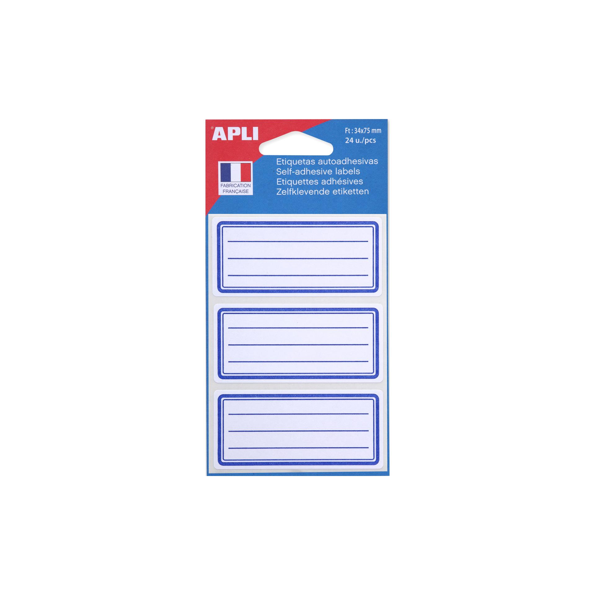 Étiquettes scolaires lignes et cadre bleus adhésif permanent 34x75 mm. Pochette de 24 étiquettes.