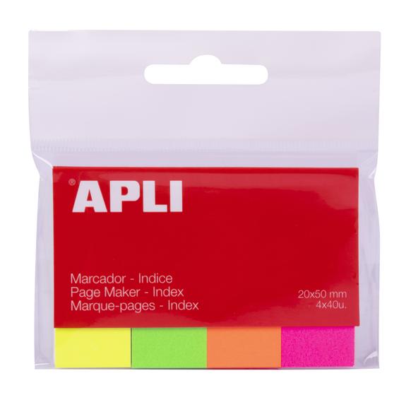 Paquet de 4 couleurs d’index de 50 x 20 mm souples. 40 index par couleur en format livre pratique : rose fluo, orange fluo, vert fluo et jaune fluo. Les marque-pages d’APLI sont parfaits pour marquer ou trouver une information rapidement et efficacement ou pour classer des informations selon leur couleur. Idéal pour écrire par-dessus. L’adhésif repositionnable permet de les coller plusieurs fois sans laisser de résidu.