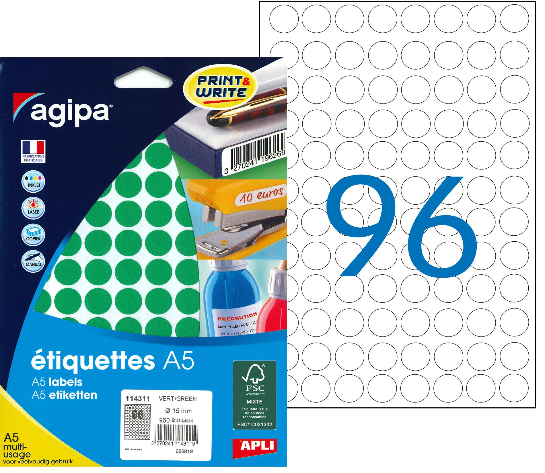 Pastilles verte multi usage Ø 15 mm. Pochette 10 feuilles A5 multi-usage soit 960 pastilles. Adhésif permanent.