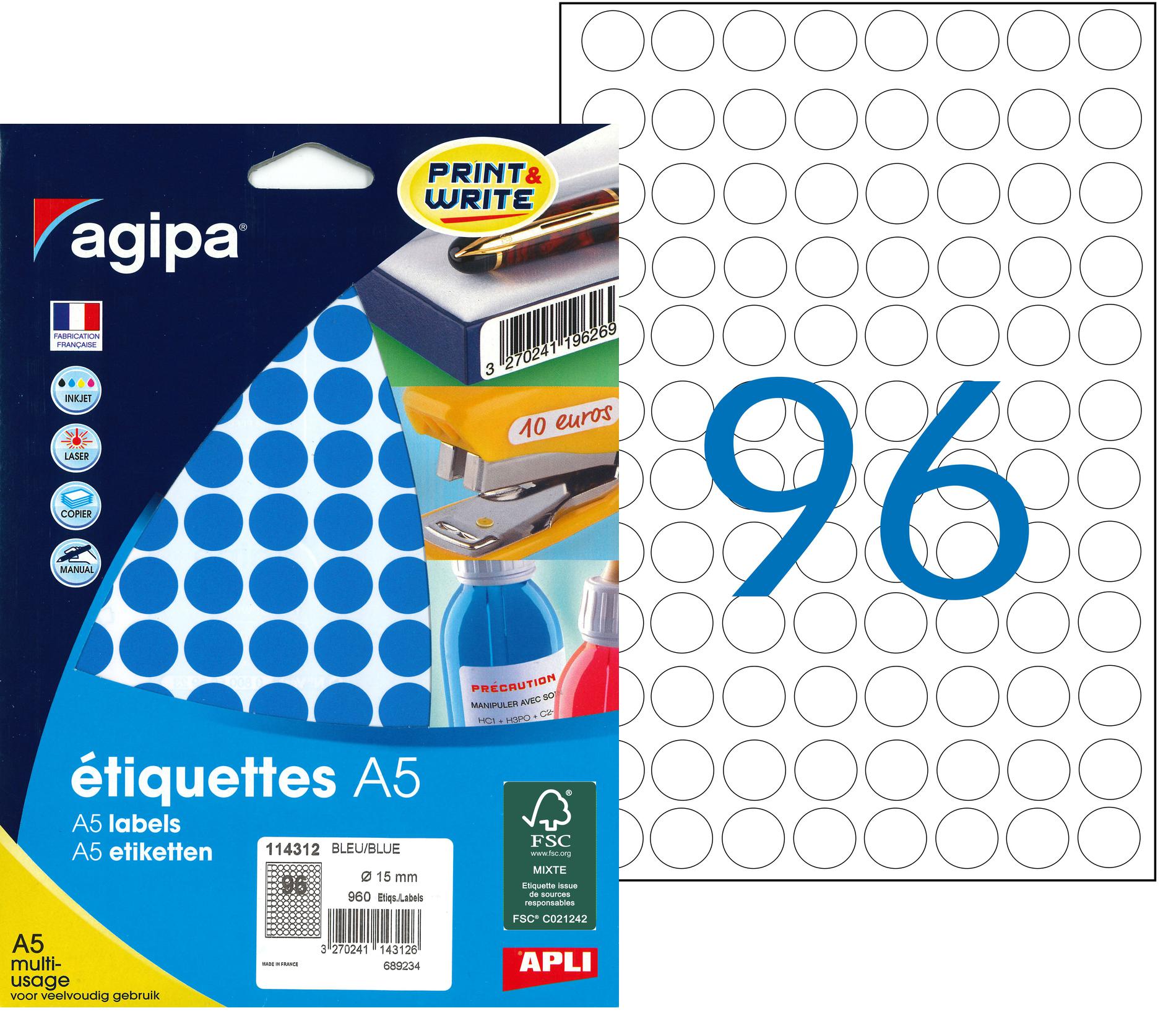 Pastilles bleu multi usage Ø 15 mm. Pochette 10 feuilles A5 multi-usage soit 960 pastilles. Adhésif permanent.