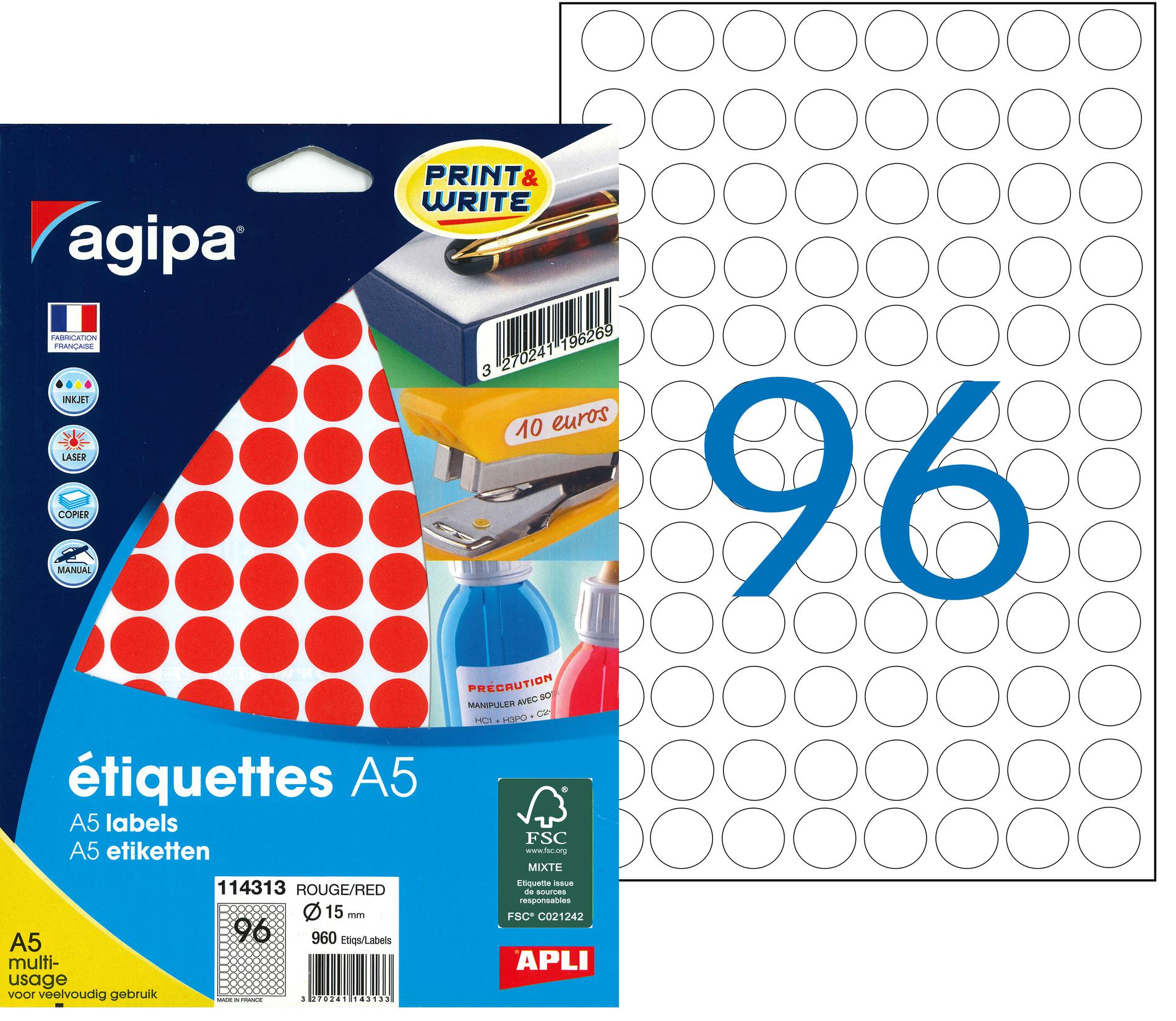Pastilles rouge multi usage Ø 15 mm. Pochette 10 feuilles A5 multi-usage soit 960 pastilles. Adhésif permanent.