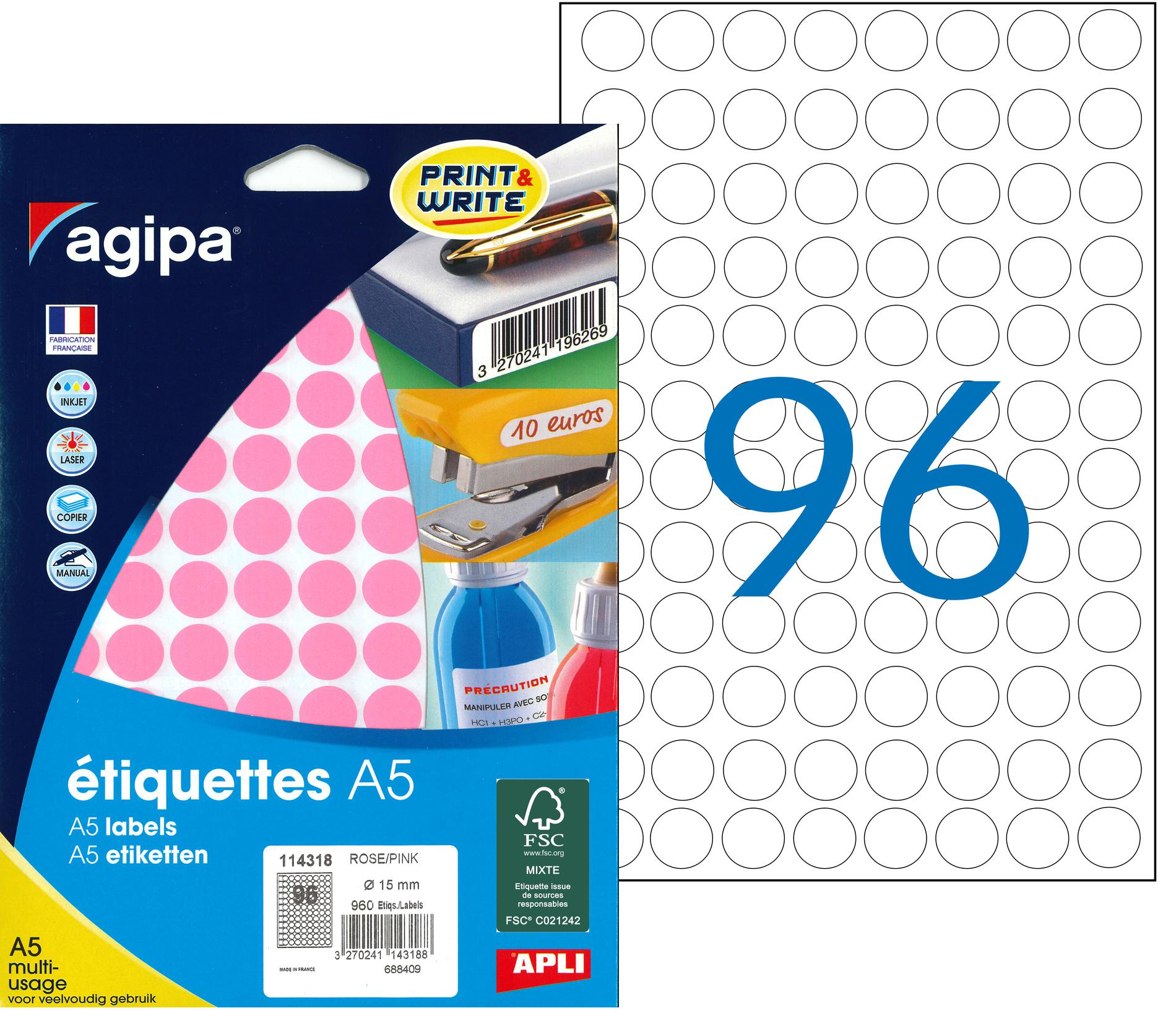 Pastilles rose multi usage Ø 15 mm. Pochette 10 feuilles A5 multi-usage soit 960 pastilles. Adhésif permanent.