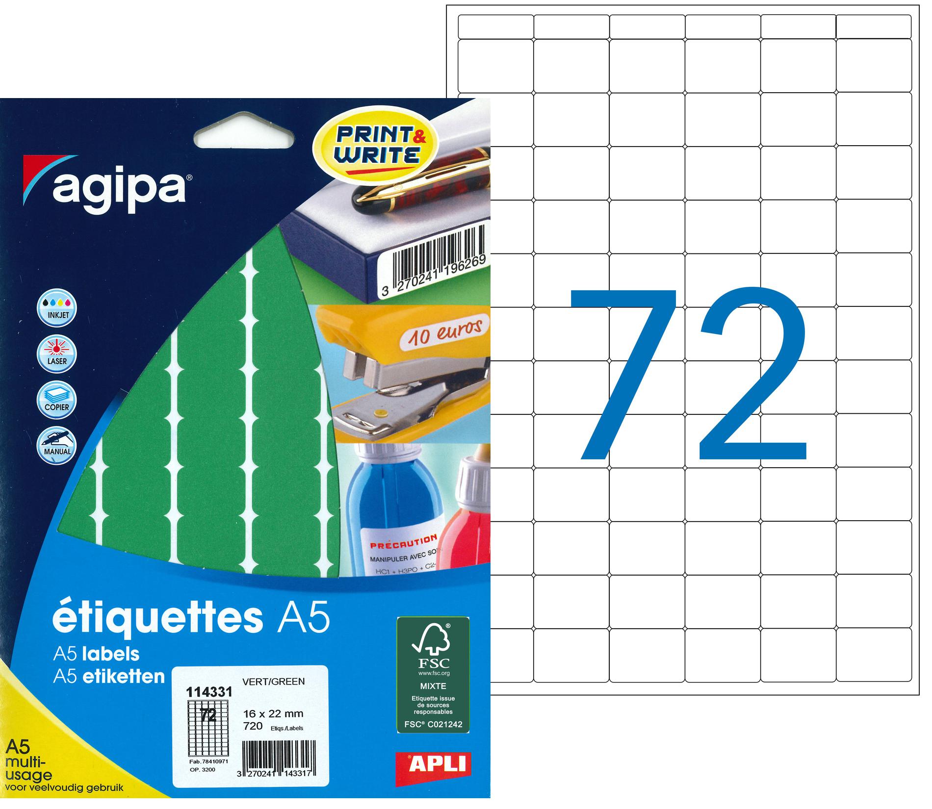 Étiquettes verte multi usage 16x 22 mm. Pochette 10 feuilles A5 multi-usage soit 720 étiquettes. Adhésif permanent.
