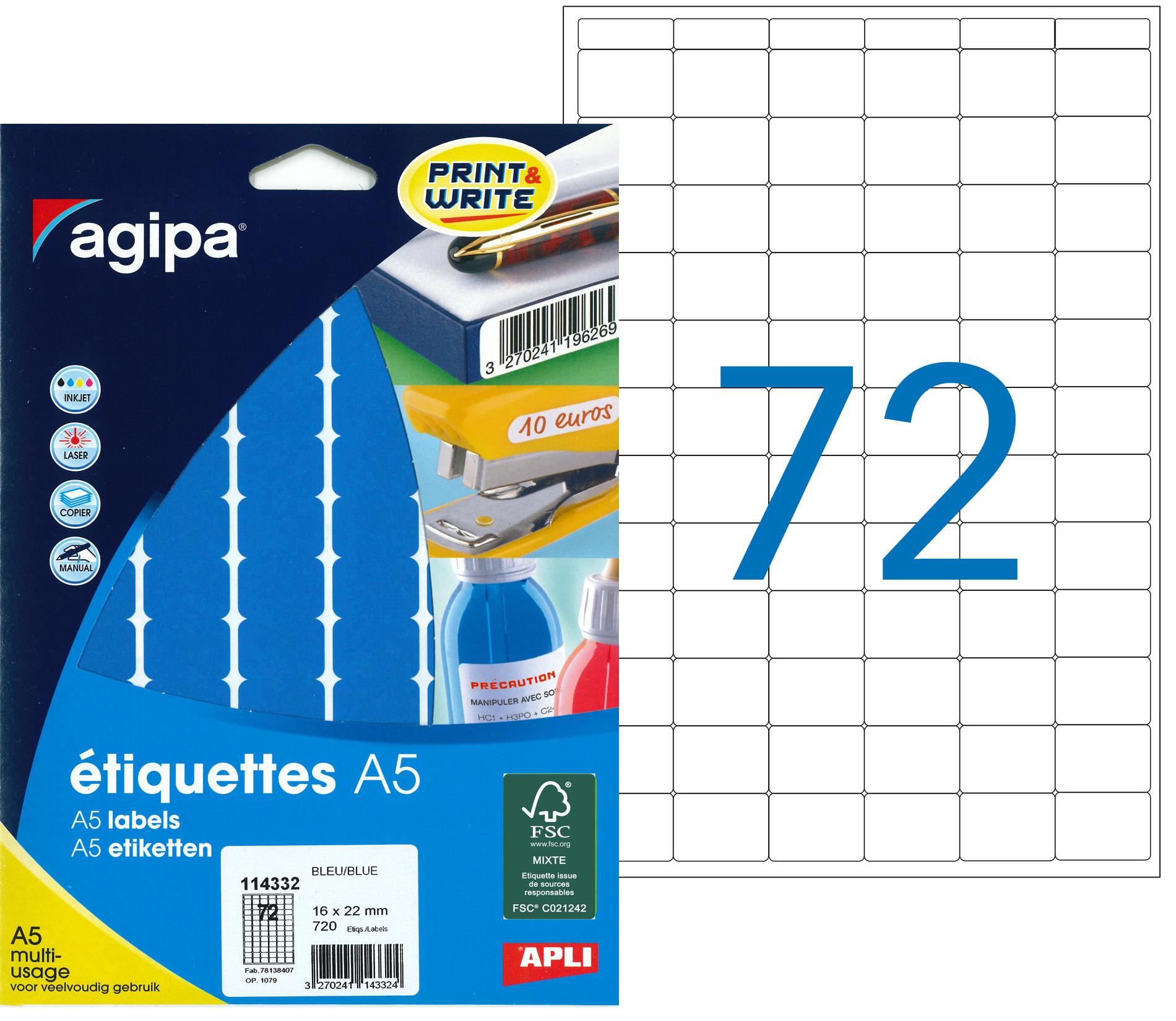 Étiquettes bleue multi usage 16x 22 mm. Pochette 10 feuilles A5 multi-usage soit 720 étiquettes. Adhésif permanent.