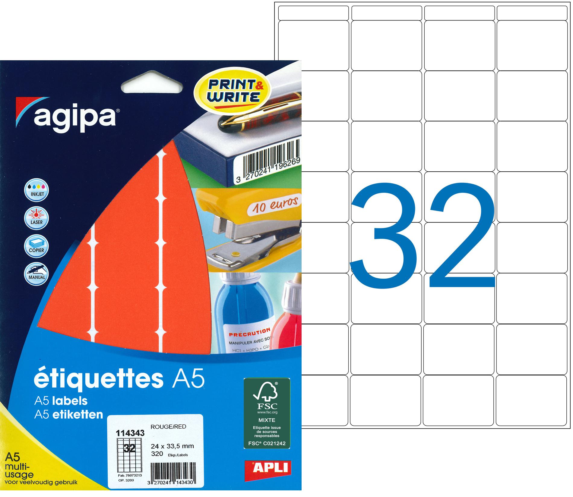 Étiquettes rouge multi usage 24 x 33,5 mm. Pochette 10 feuilles A5 multi-usage soit 320 étiquettes. Adhésif permanent.