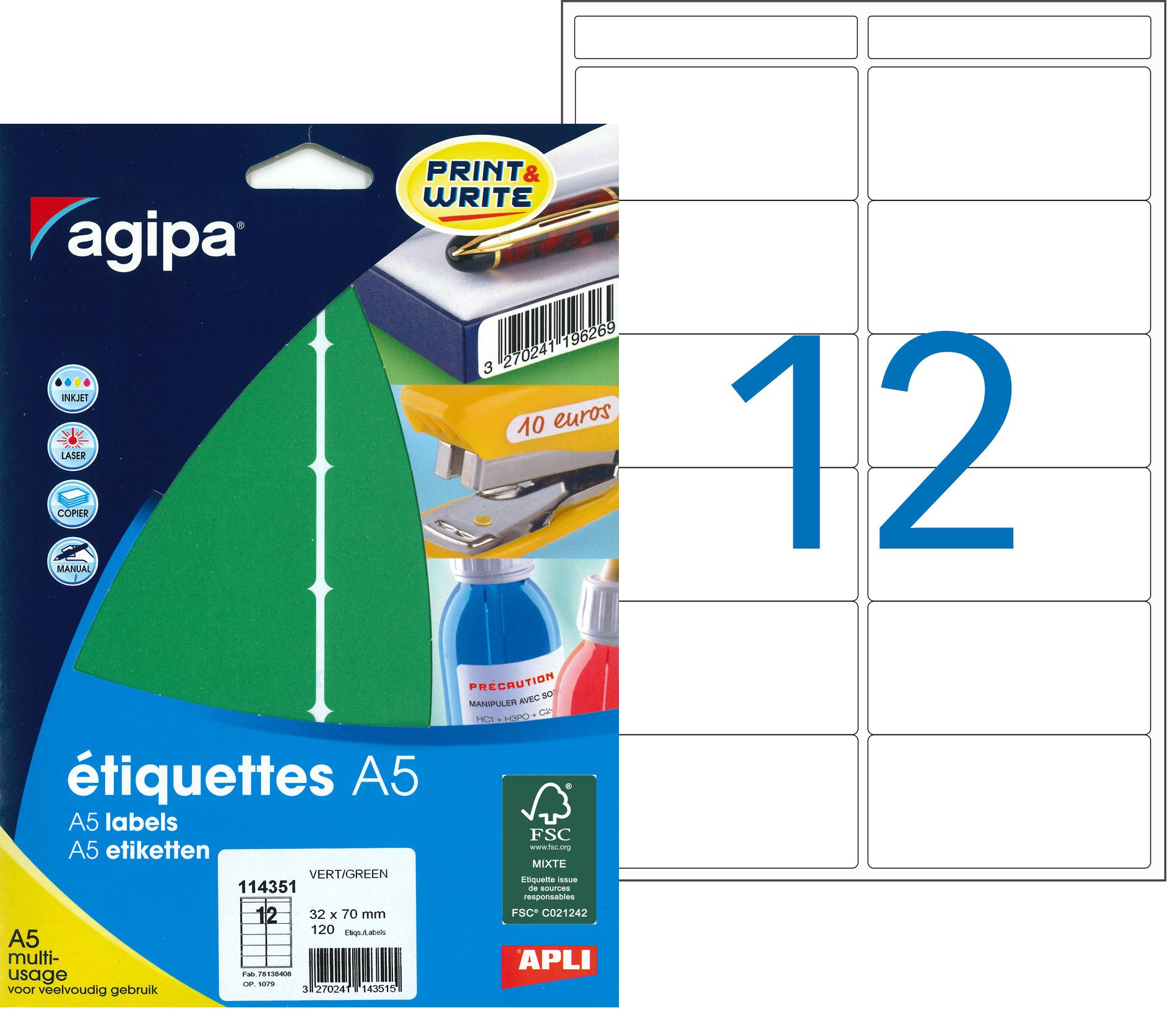 Étiquettes verte multi usage 32x70 mm. Pochette 10 feuilles A5 multi-usage soit 120 étiquettes. Adhésif permanent.