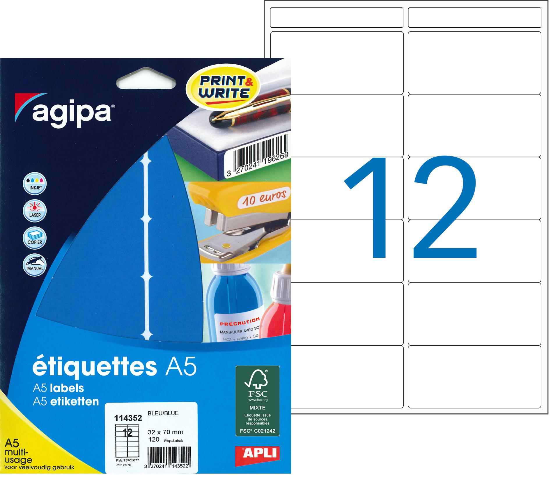 Étiquettes bleue multi usage 32 x 70 mm. Pochette 10 feuilles A5 multi-usage soit 120 étiquettes. Adhésif permanent.