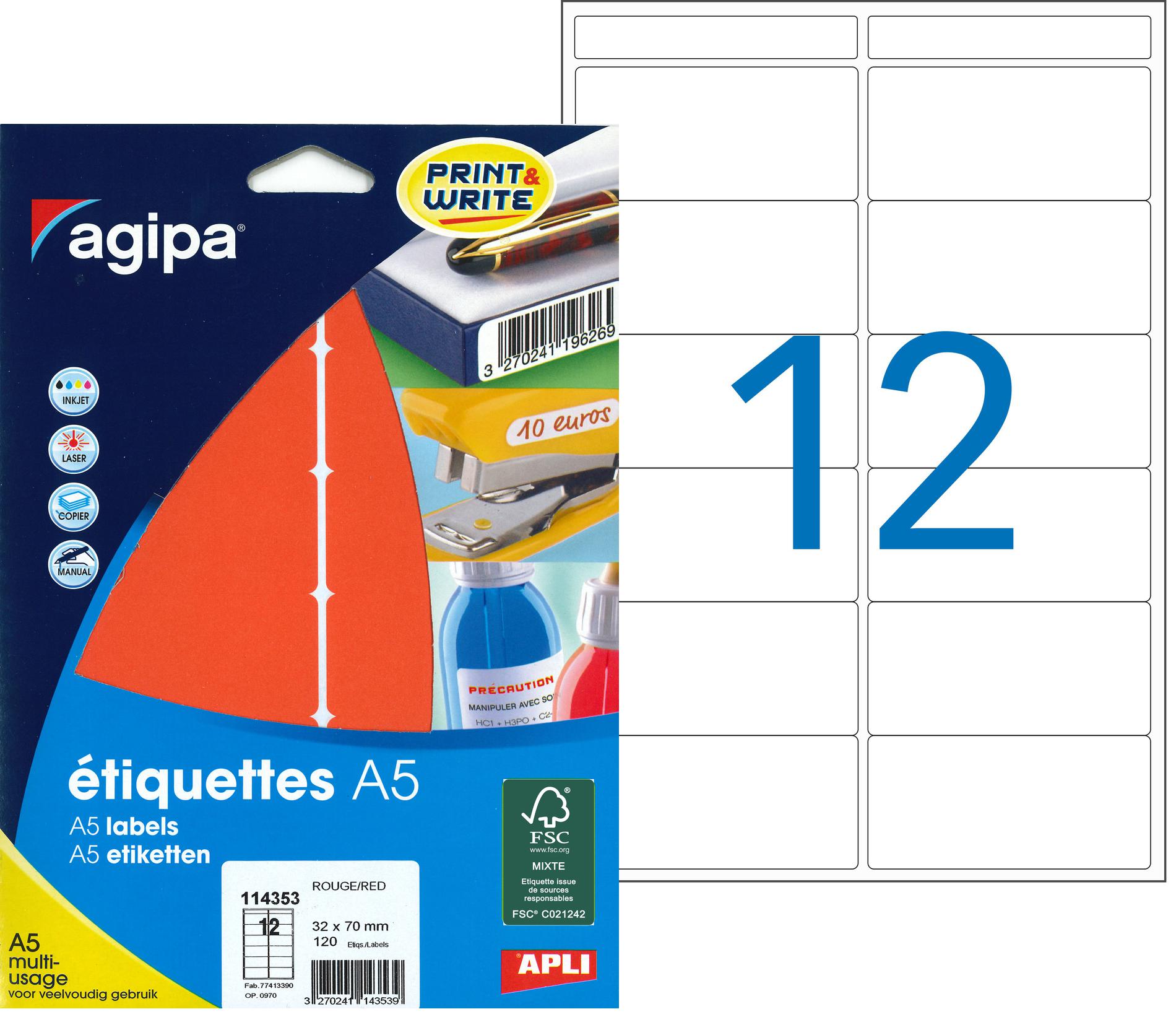 Étiquettes rouge multi usage 32 x 70 mm. Pochette 10 feuilles A5 multi-usage soit 120 étiquettes. Adhésif permanent.
