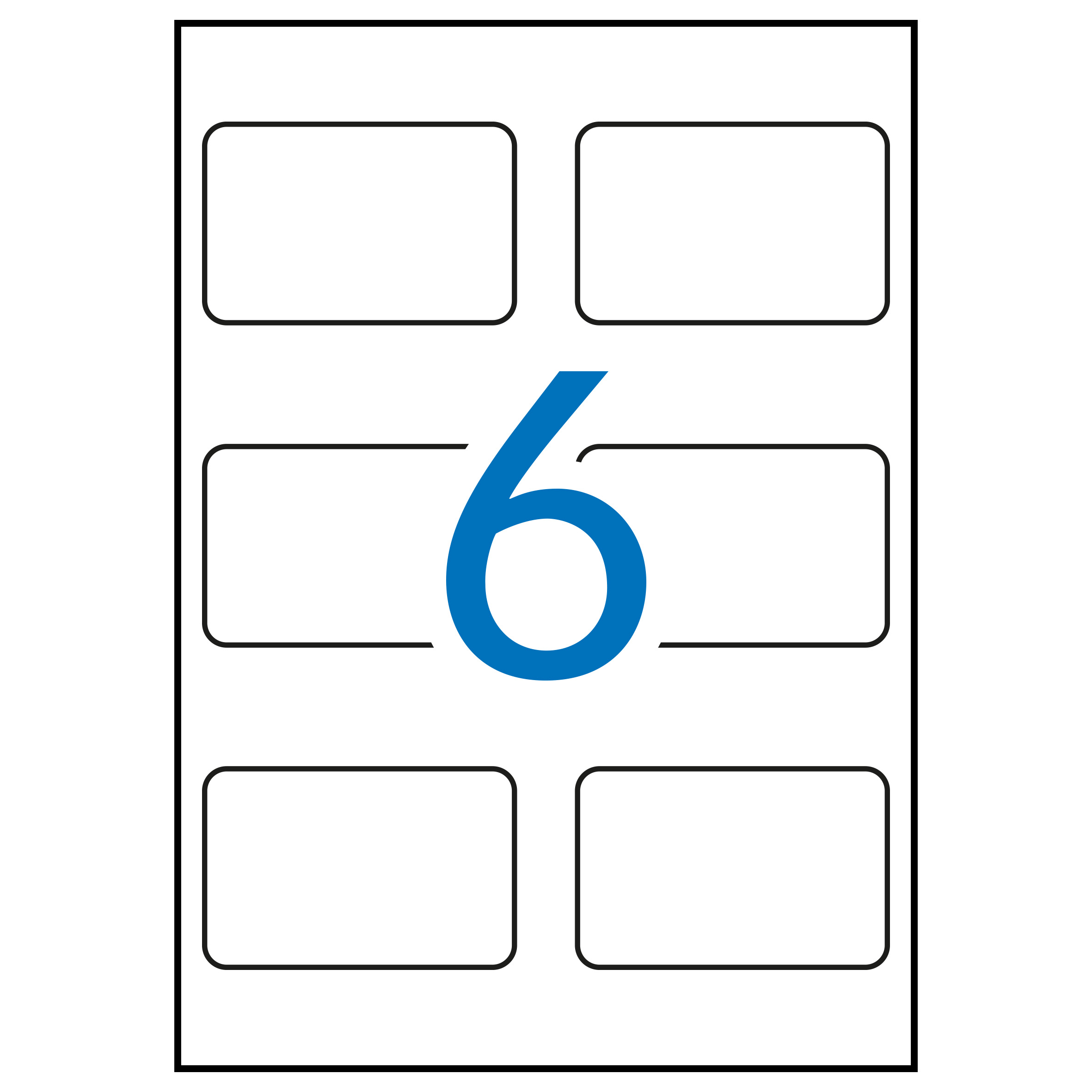 Etiquettes blanches plastifiées bords arrondis dimensions 84,5 x 54,0 mm avec un adhésif permanent. Paquet de 10 feuilles (60 étiquettes).