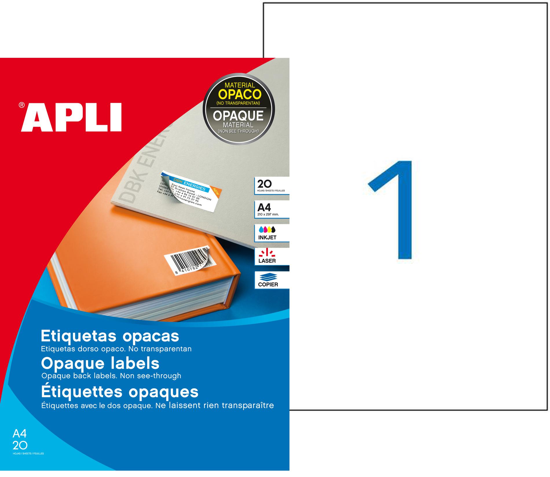 Etiquettes blanches opaques coins droits dimensions 210,0 x 297,0 mm avec un adhésif permanent. Paquet de 20 feuilles (20 étiquettes).