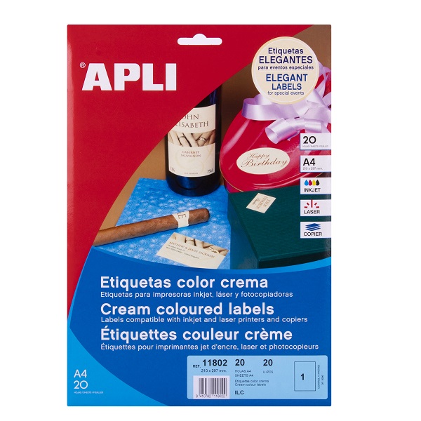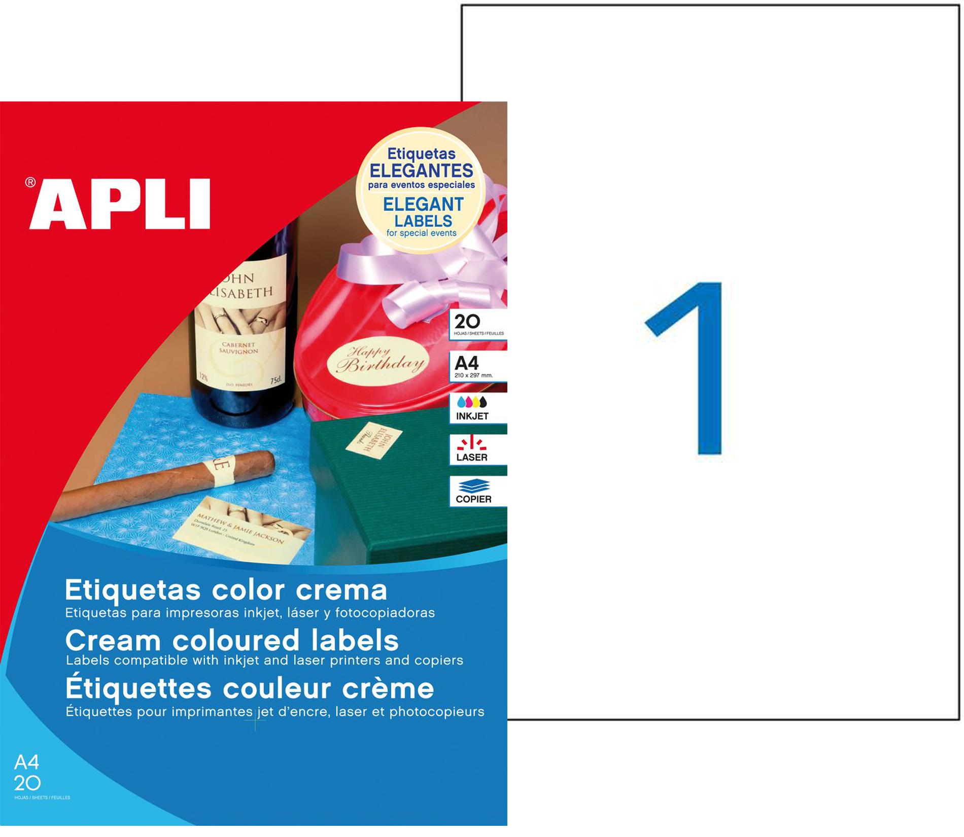 Etiquettes crème coins droits dimensions 210,0 x 297,0 mm avec un adhésif permanent. Paquet de 20 feuilles (20 étiquettes).