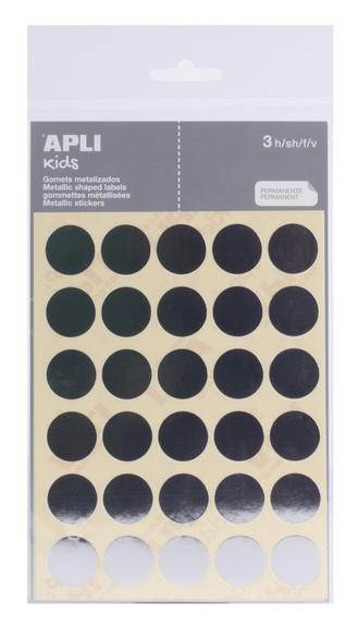 Sachet de gommettes rondes de diamètre Ø 20 mm couleur argent métallisé avec un adhésif permanent. Chaque sachet contient 3 feuilles, un total de 90 gommettes.