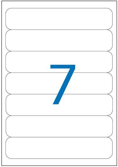 Étiquettes de couleurs assorties bords arrondis dimensions 190,0 x 38,0 mm avec un adhésif permanent format spécial dos de classeur. Paquet de 20 feuilles (140 étiquettes).