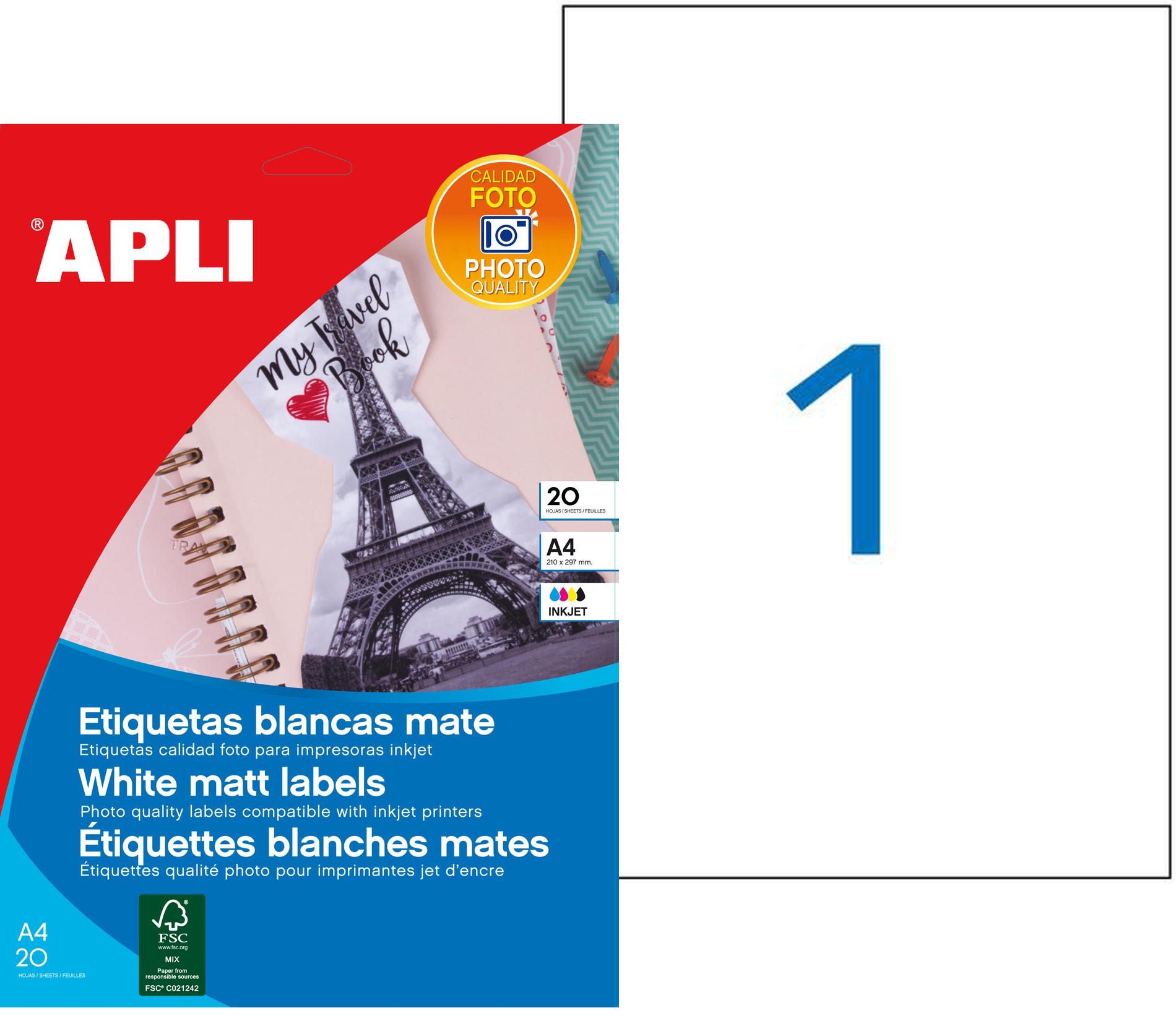 Pochette de 20 feuilles A4 jet d'encre. Étiquettes adhésives photo mates.