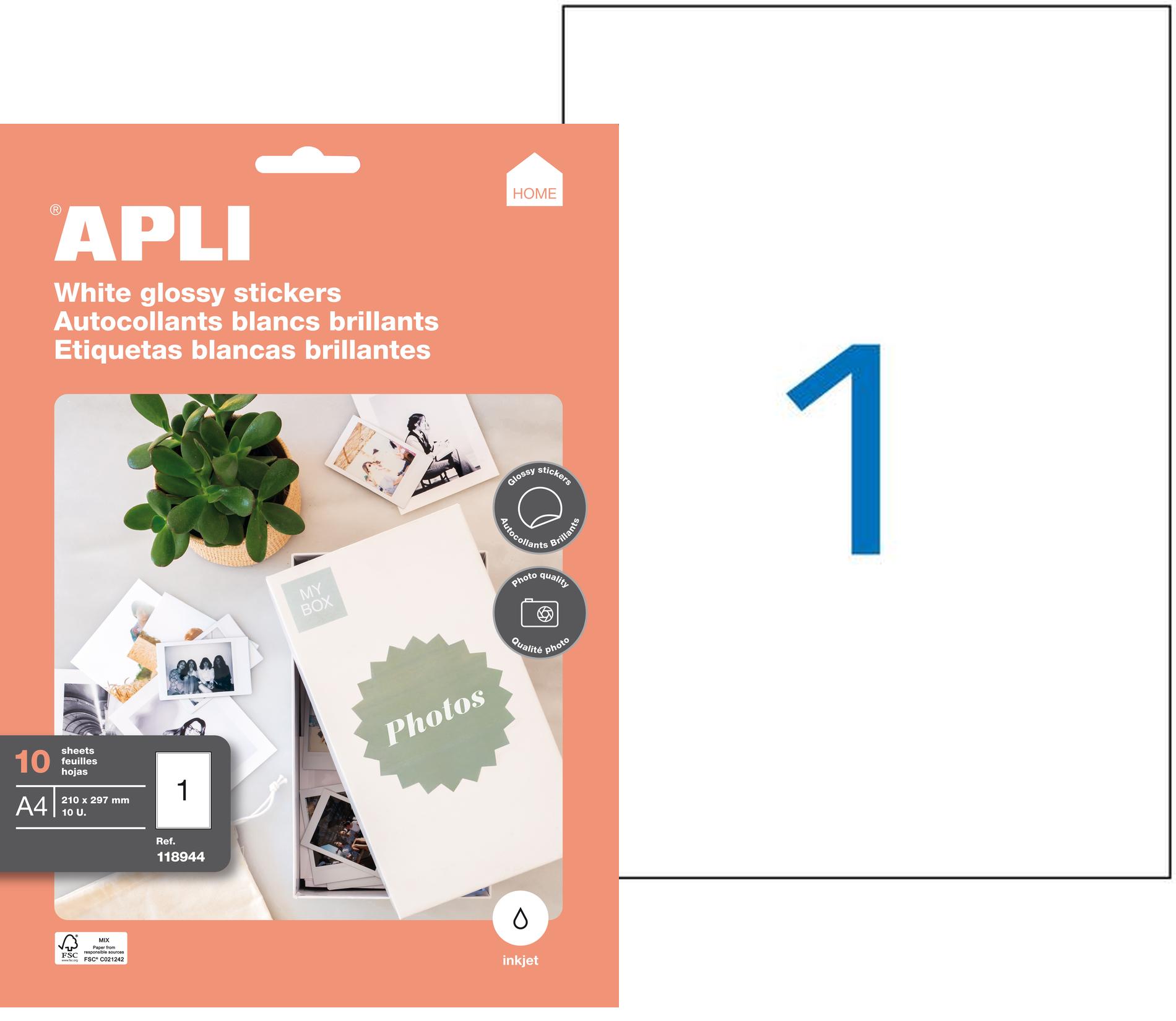 Pochette de 10 feuilles A4 jet d'encre. Étiquettes adhésives photo brillantes.